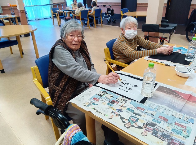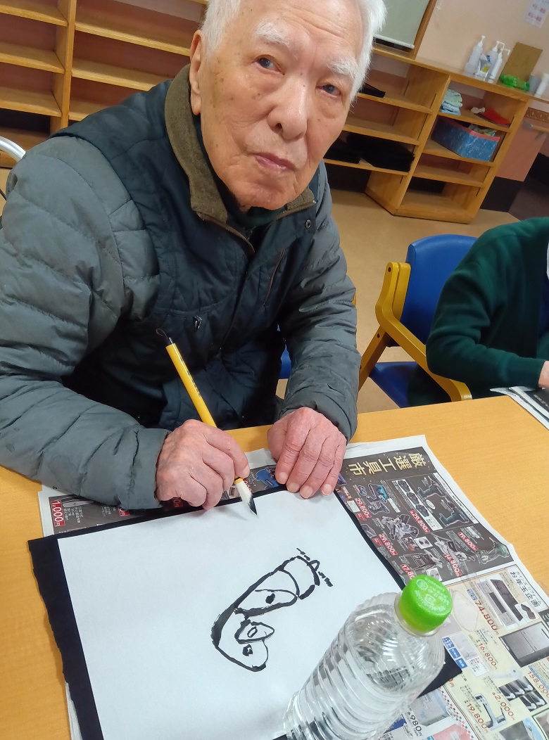 お正月の月ということで、皆様に書初めをして頂いたり、福笑いをして頂きました。