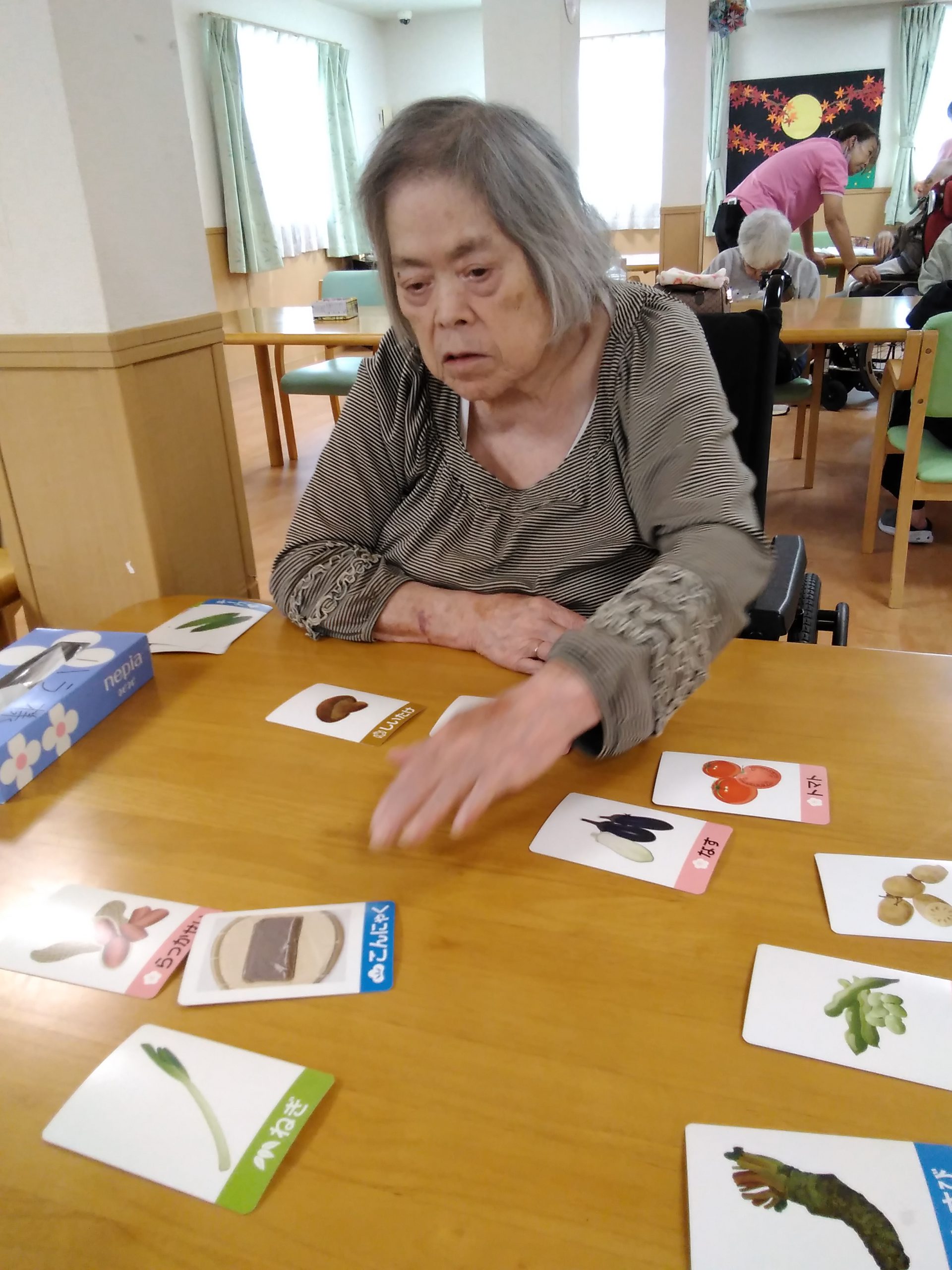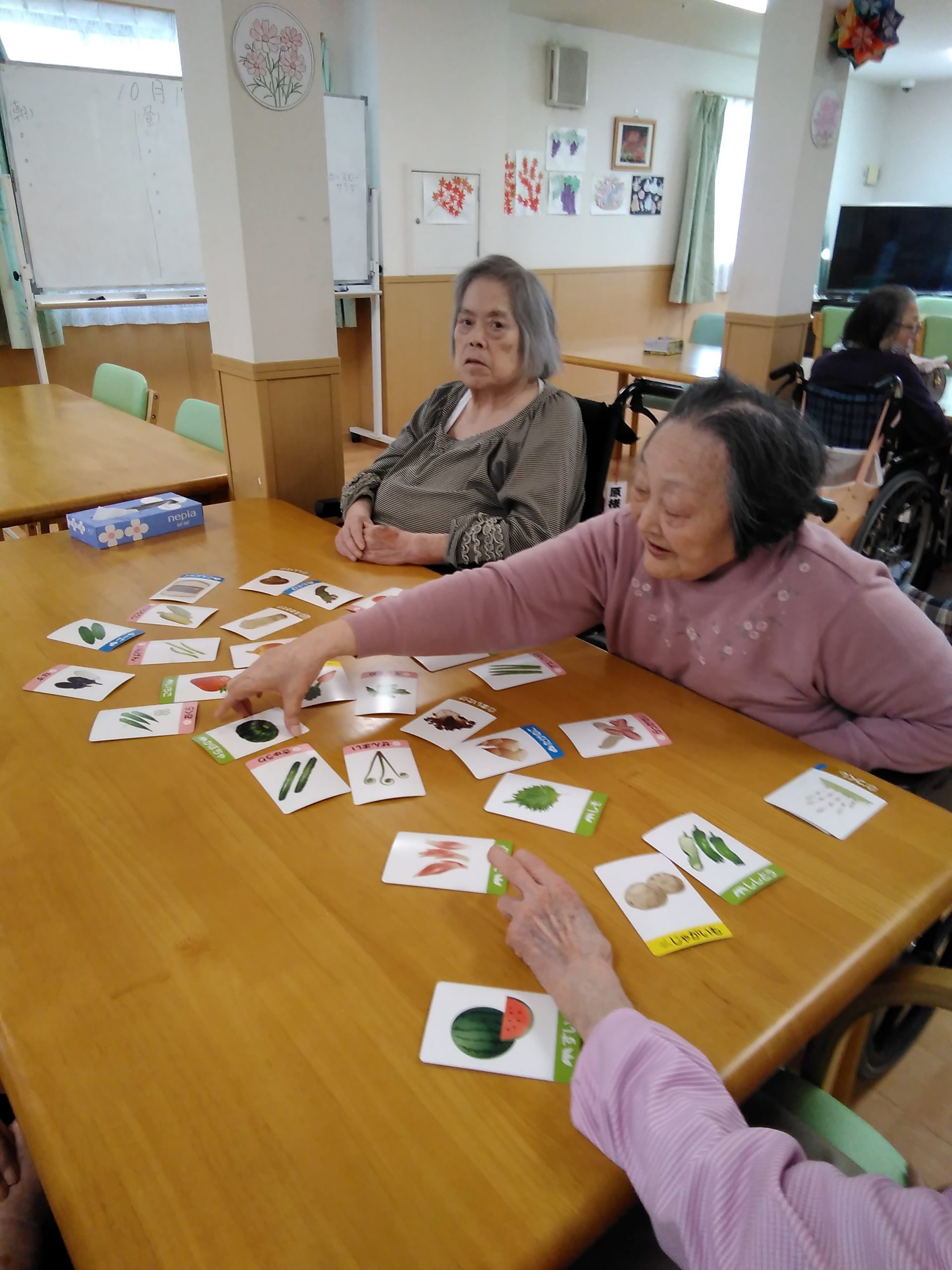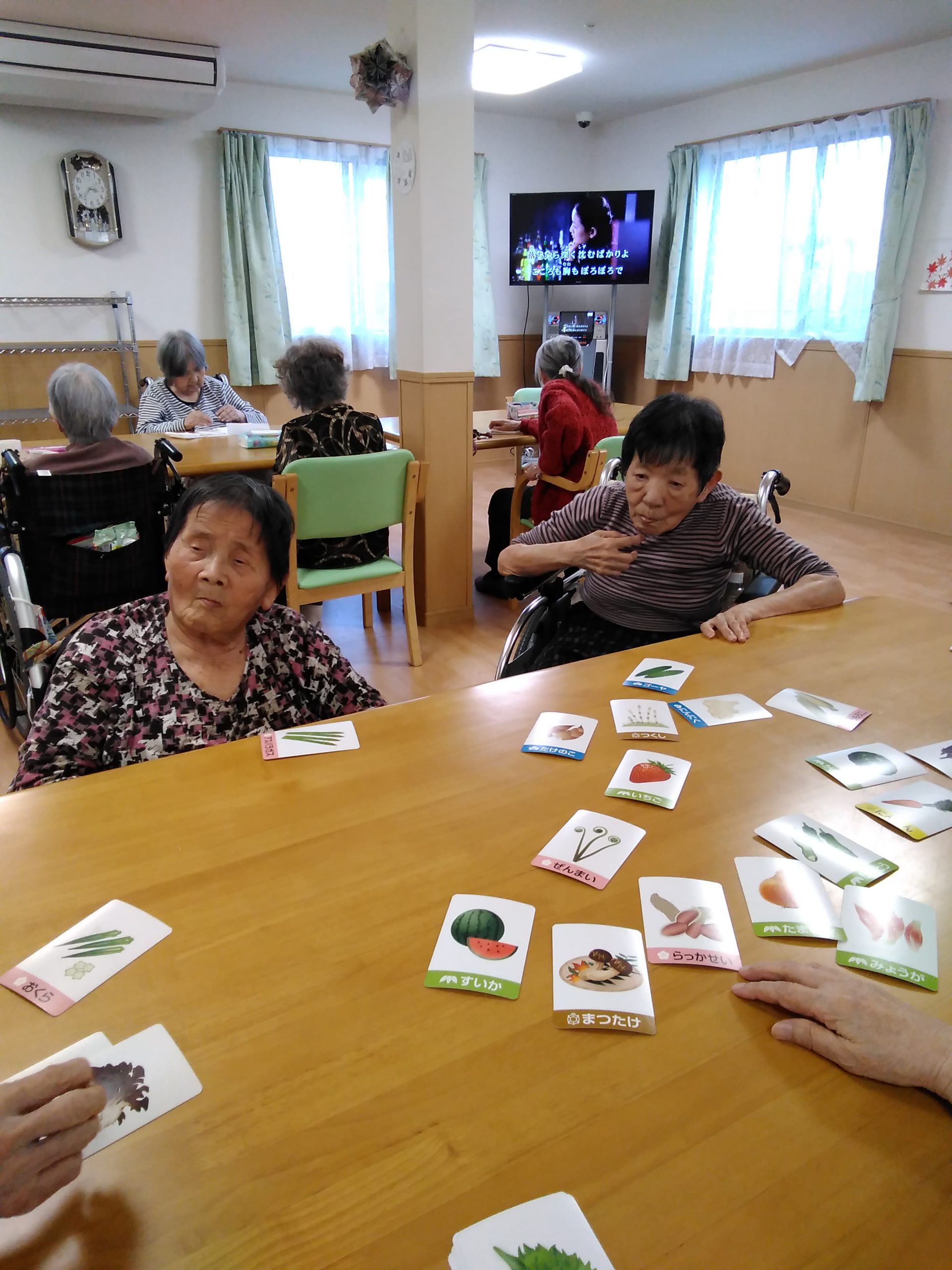こんにちは! シニアライフ門真 今日は、野菜のカルタにチャレンジしました(^^)/緑系の野菜は、お手付きが多いですねー インゲンとアスパラガスやネギとニラなど 熱い戦いになります(#^.^#) Back Next