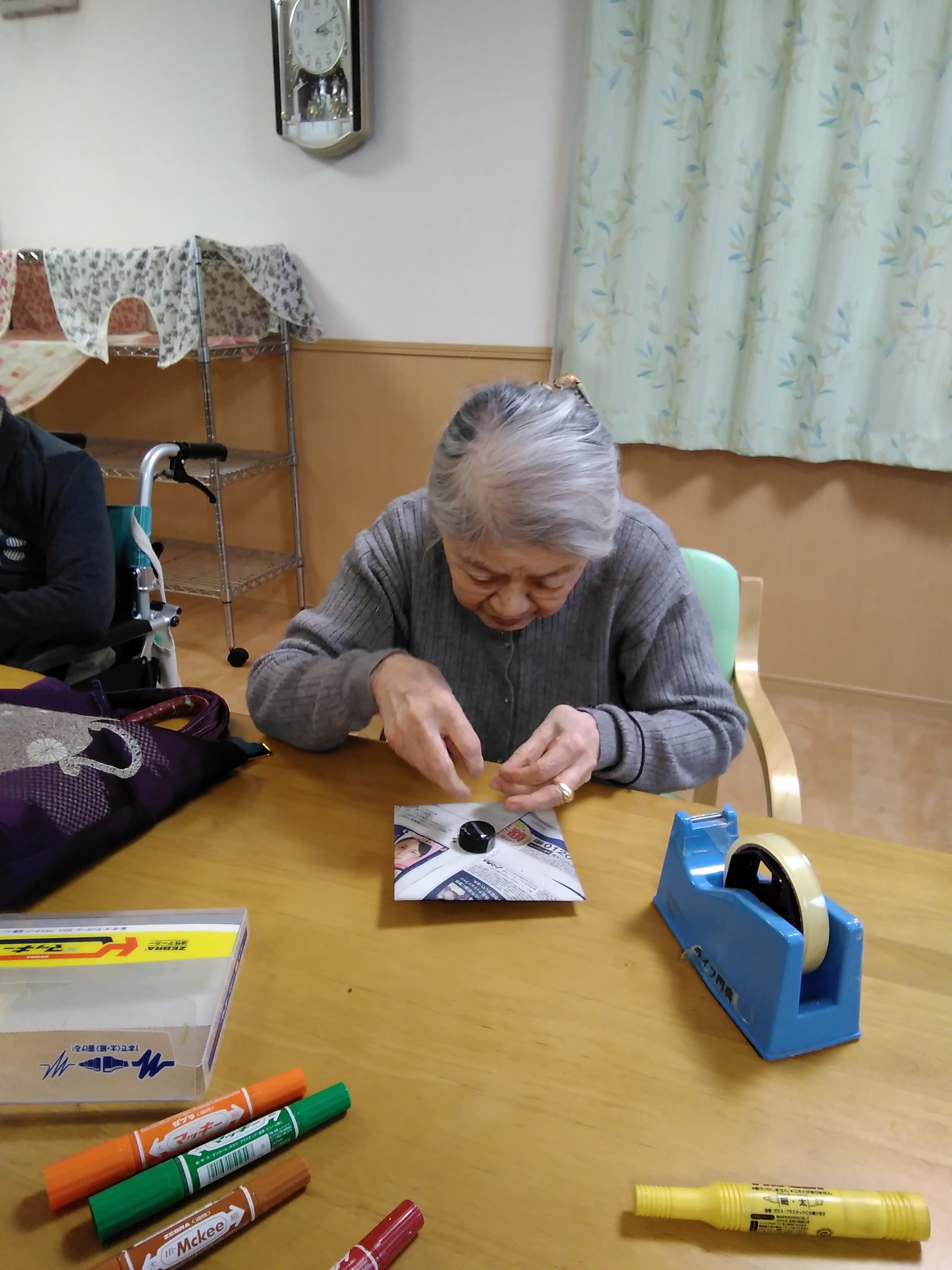 今日は、新聞紙でコマ作りに