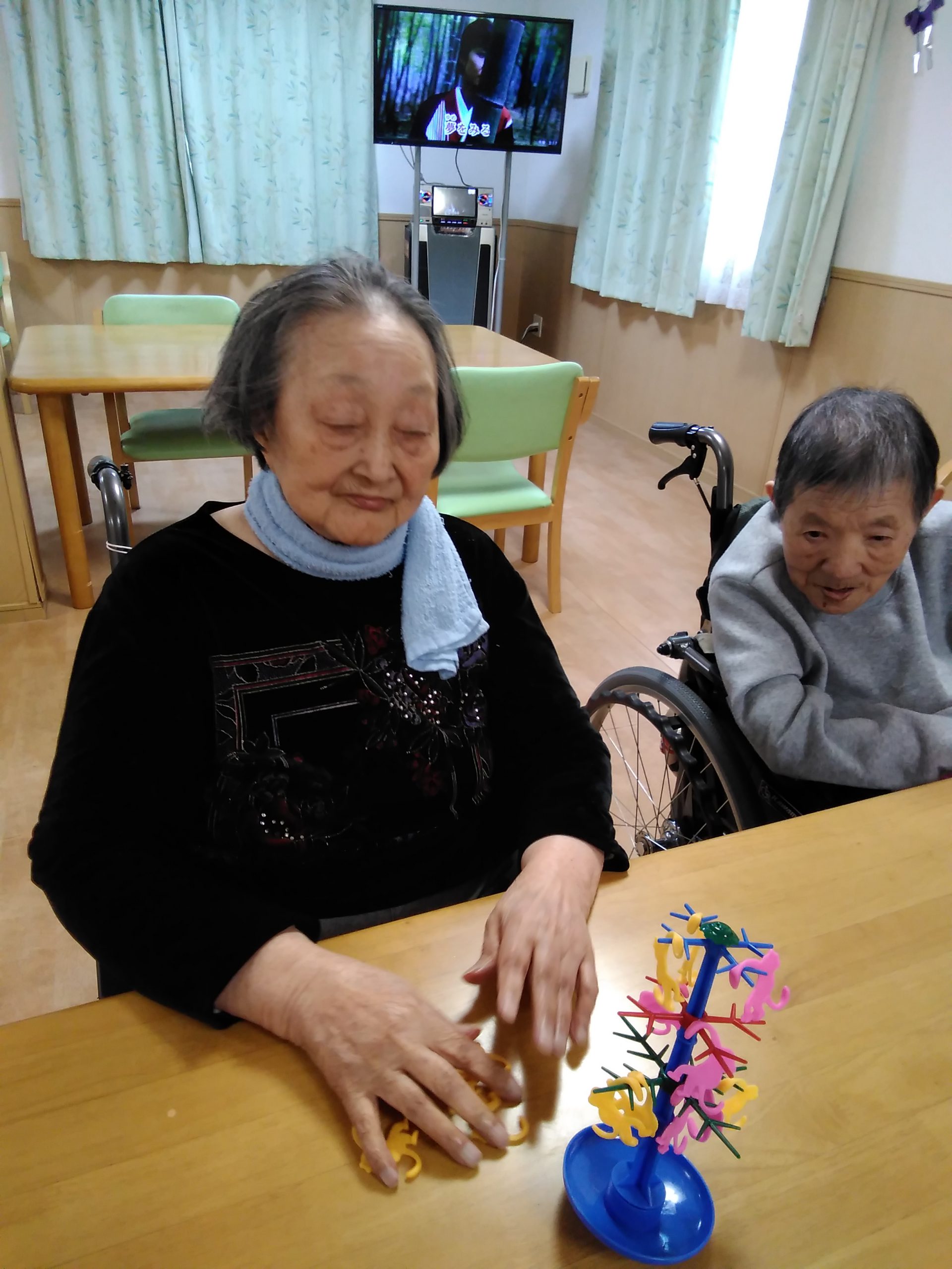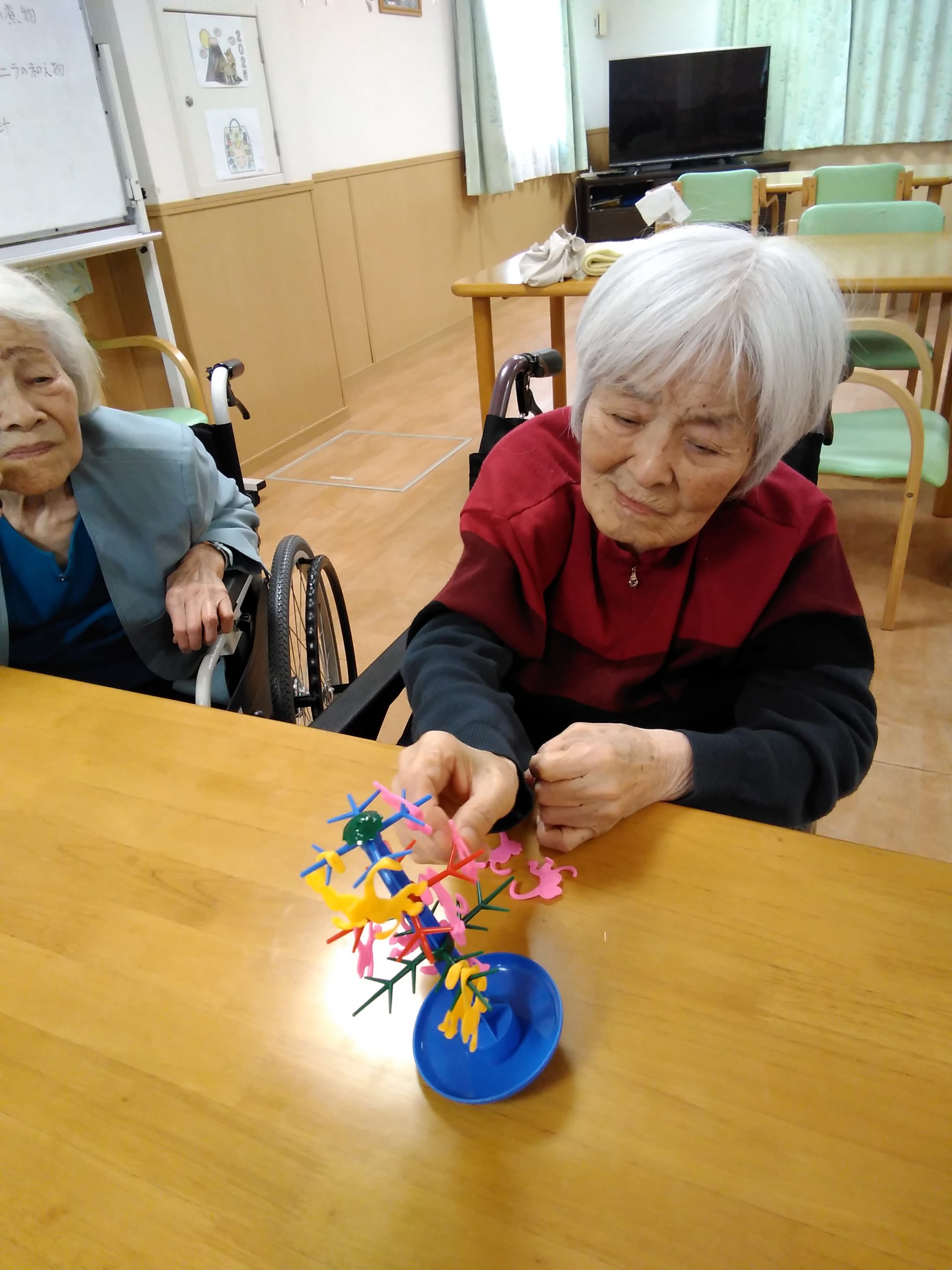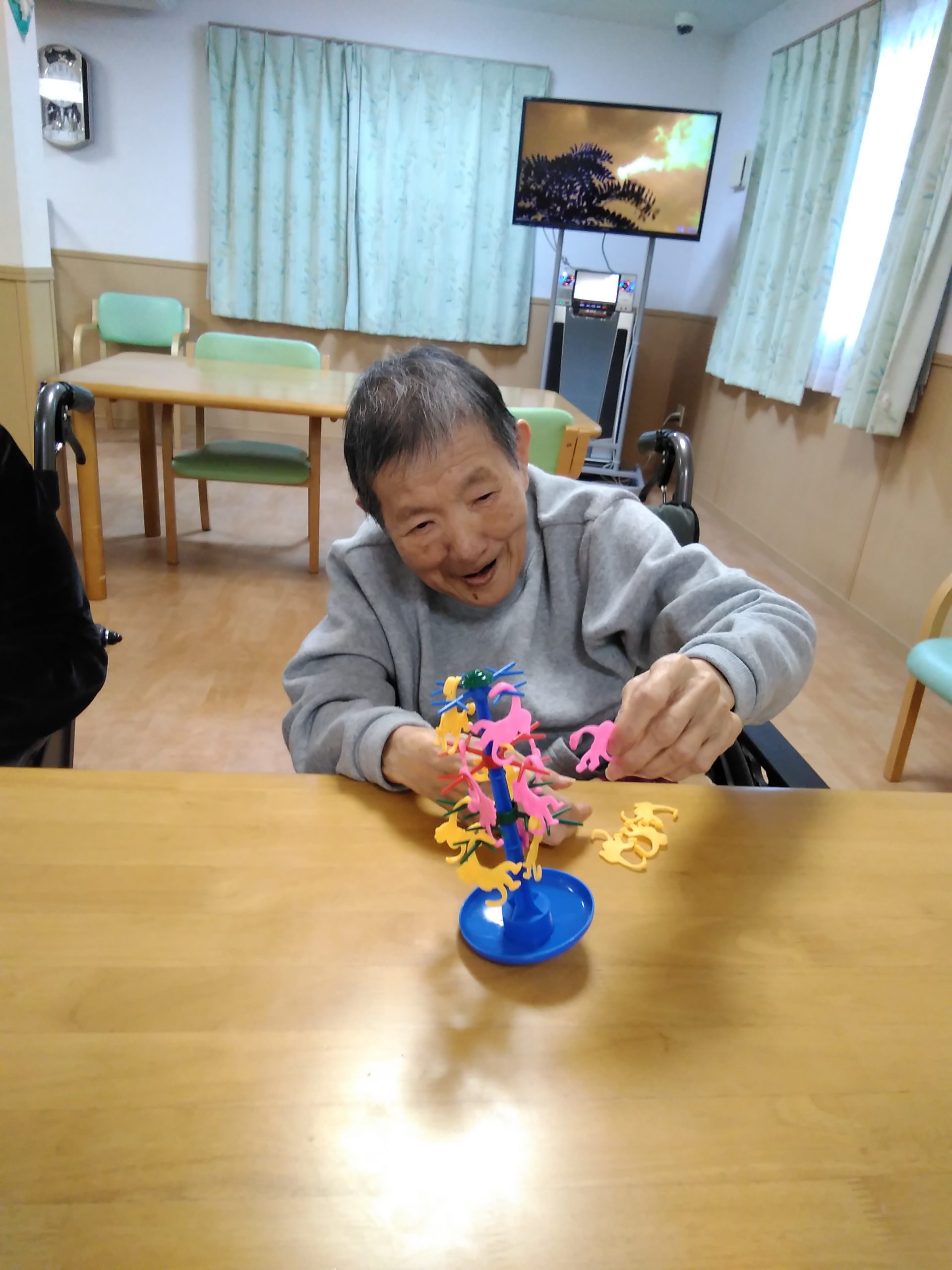 こんにちは! シニアライフ門真 今日は、バランスモンキーゲームに チャレンジしました(^^)/ グラグラと揺れる木にサルをぶら下げていく ゲームですが、かなり傾きます! ワ―!キャー!と悲鳴が(#^.^#) 楽しい時間でしたよー Back Next
