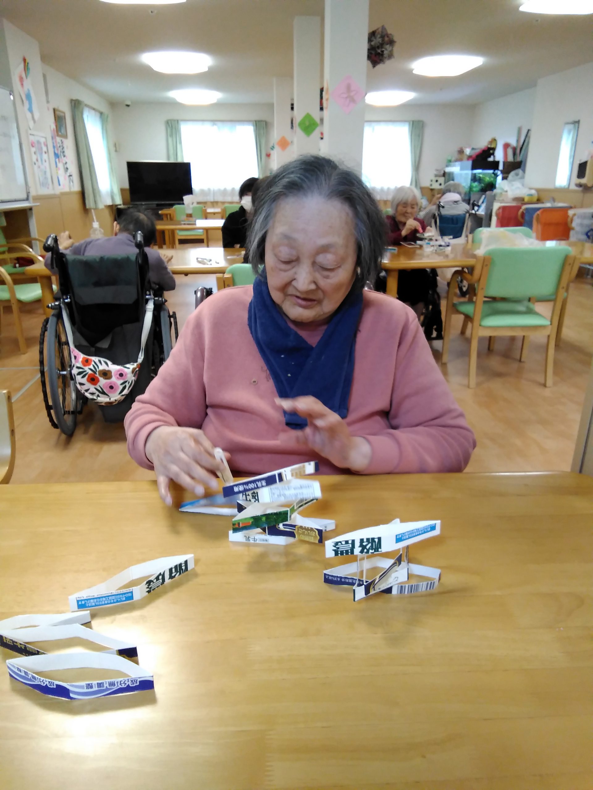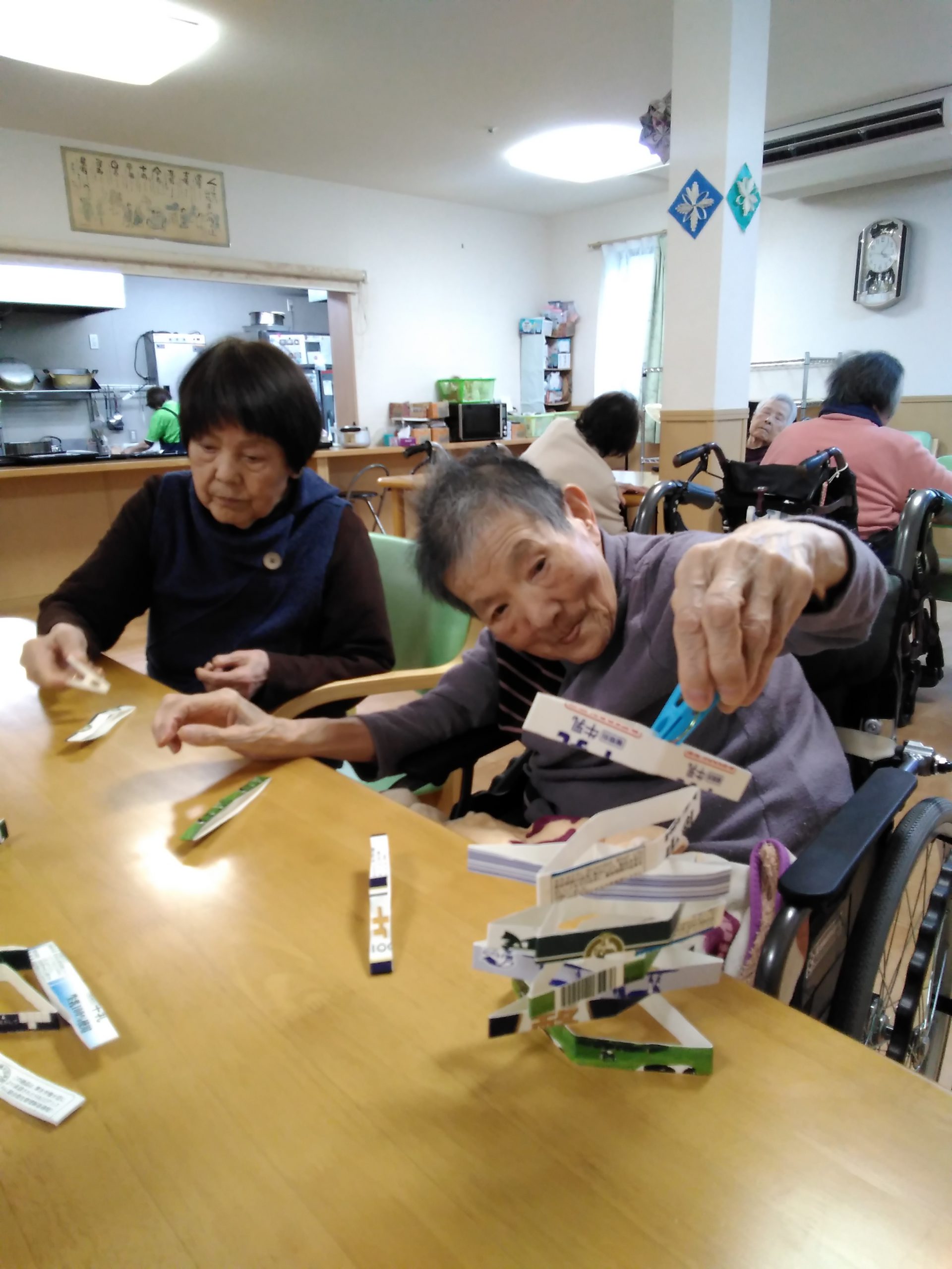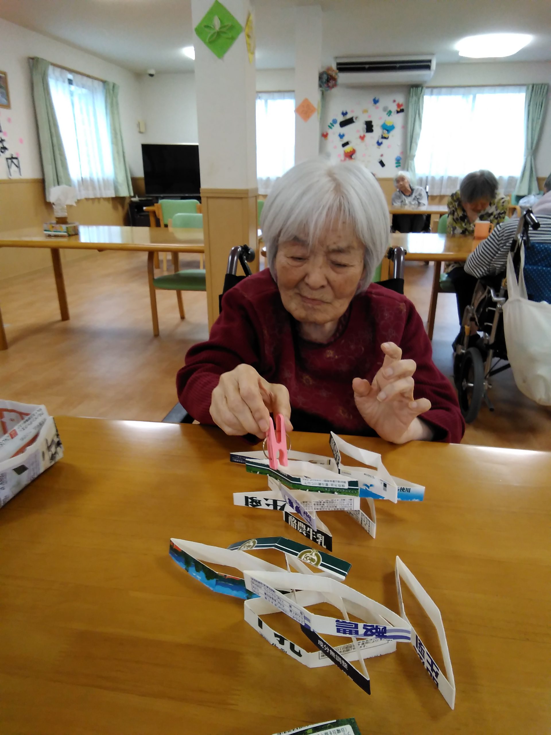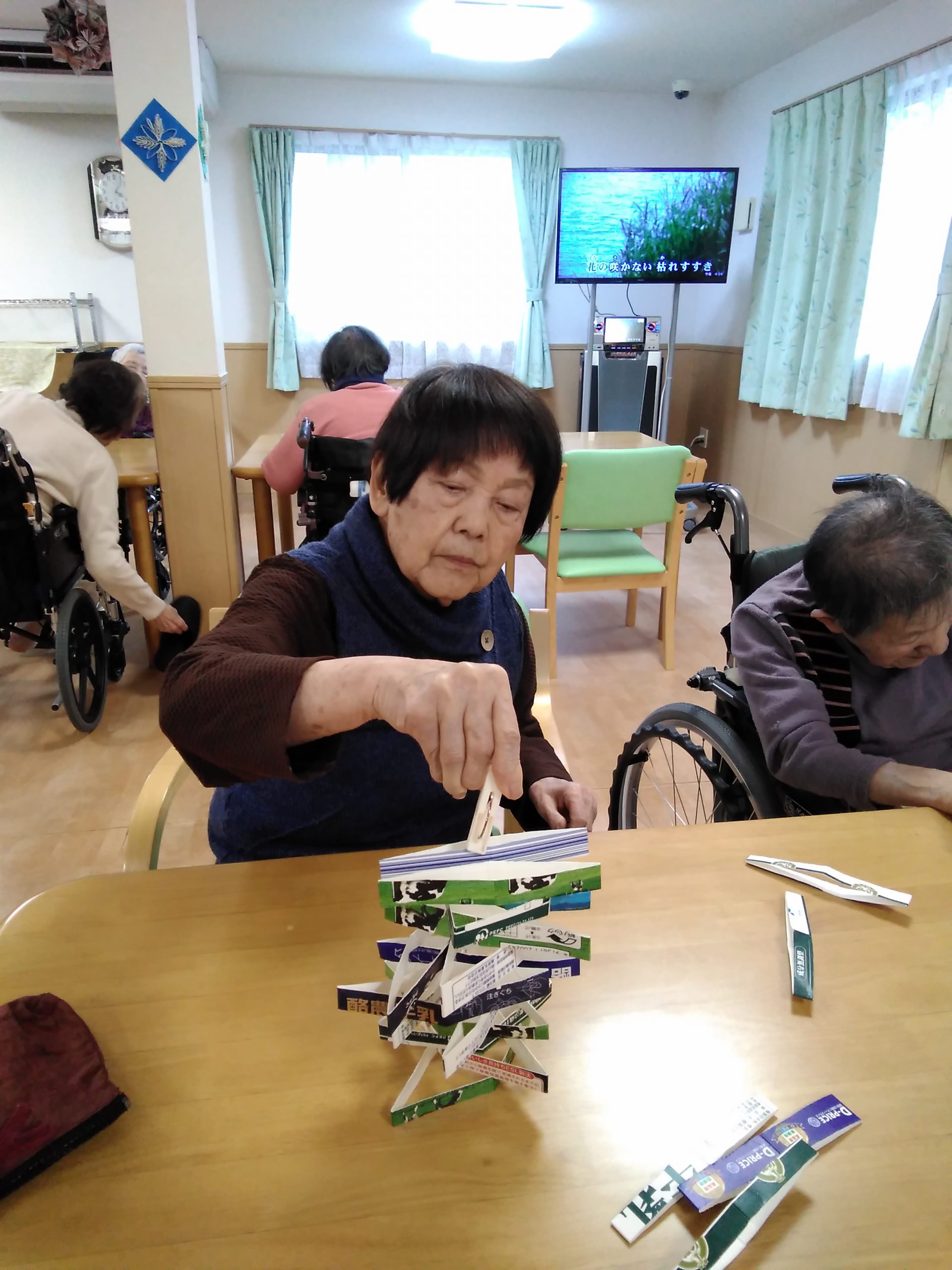 こんにちは! シニアライフ門真 今日は、牛乳パックタワーに チャレンジしました(^^)/ 手を使わずに洗濯バサミで 積み上げていきますが。。。 すぐに手が出てきてしまいます(#^.^#) Back Next