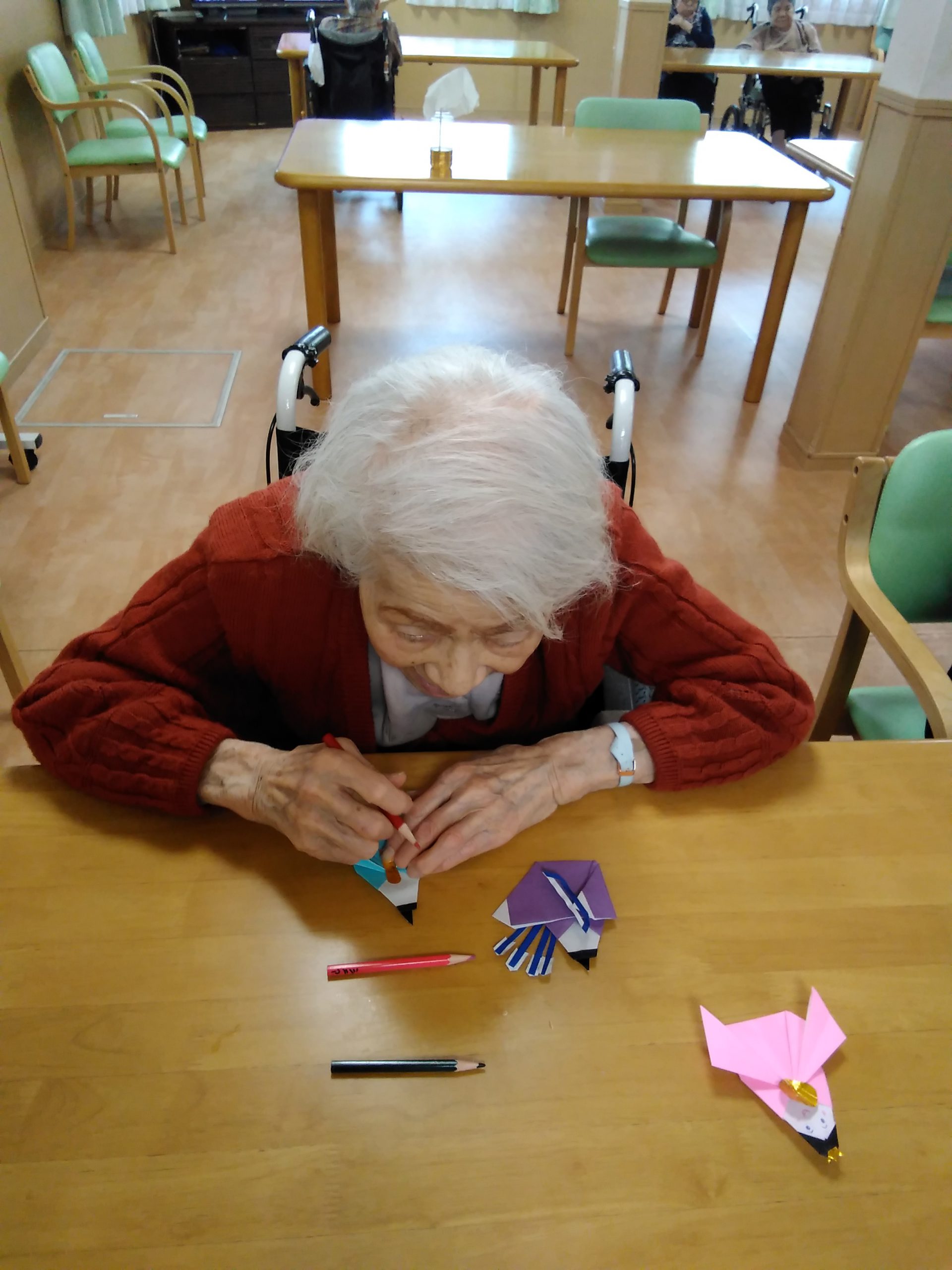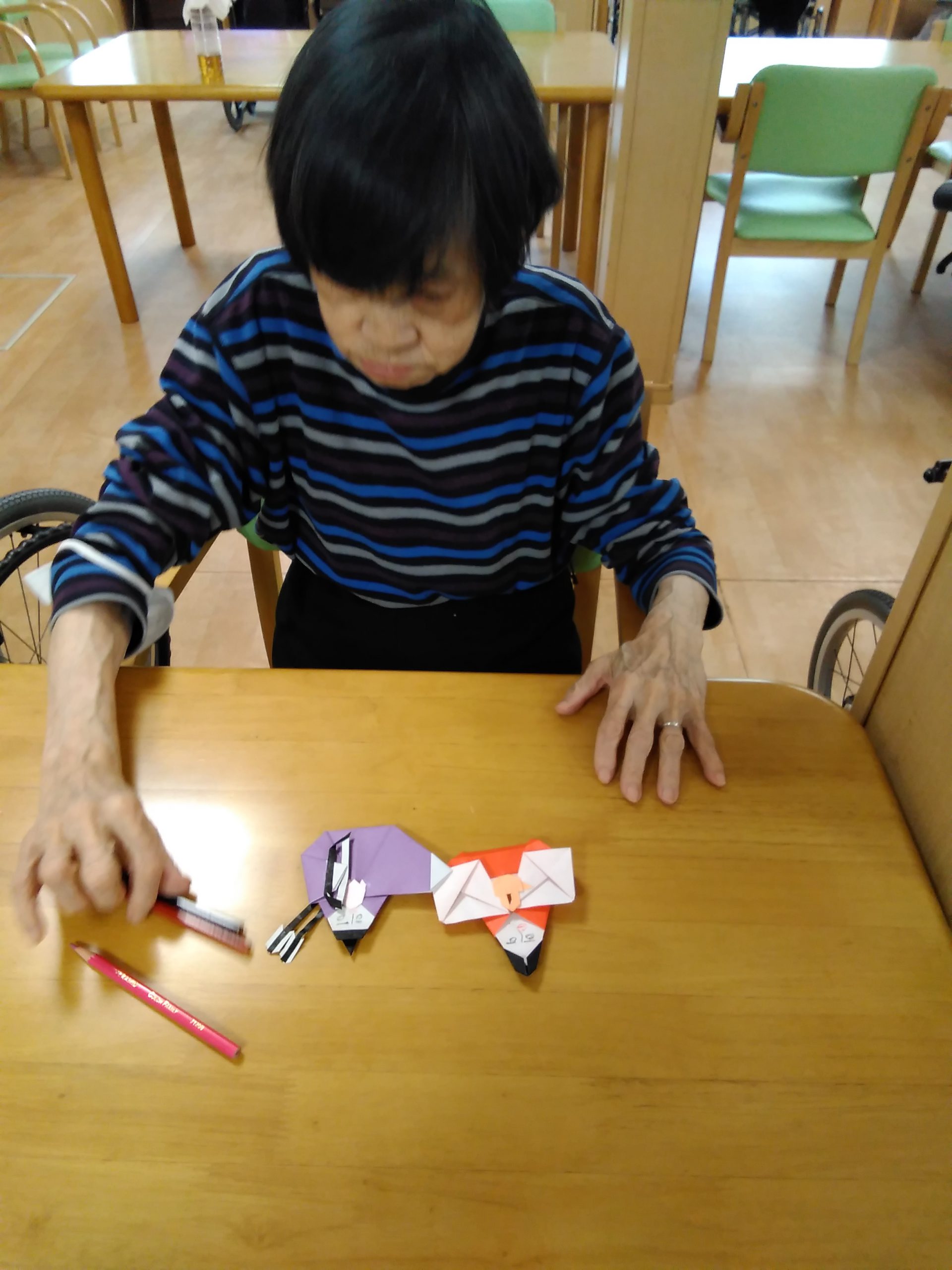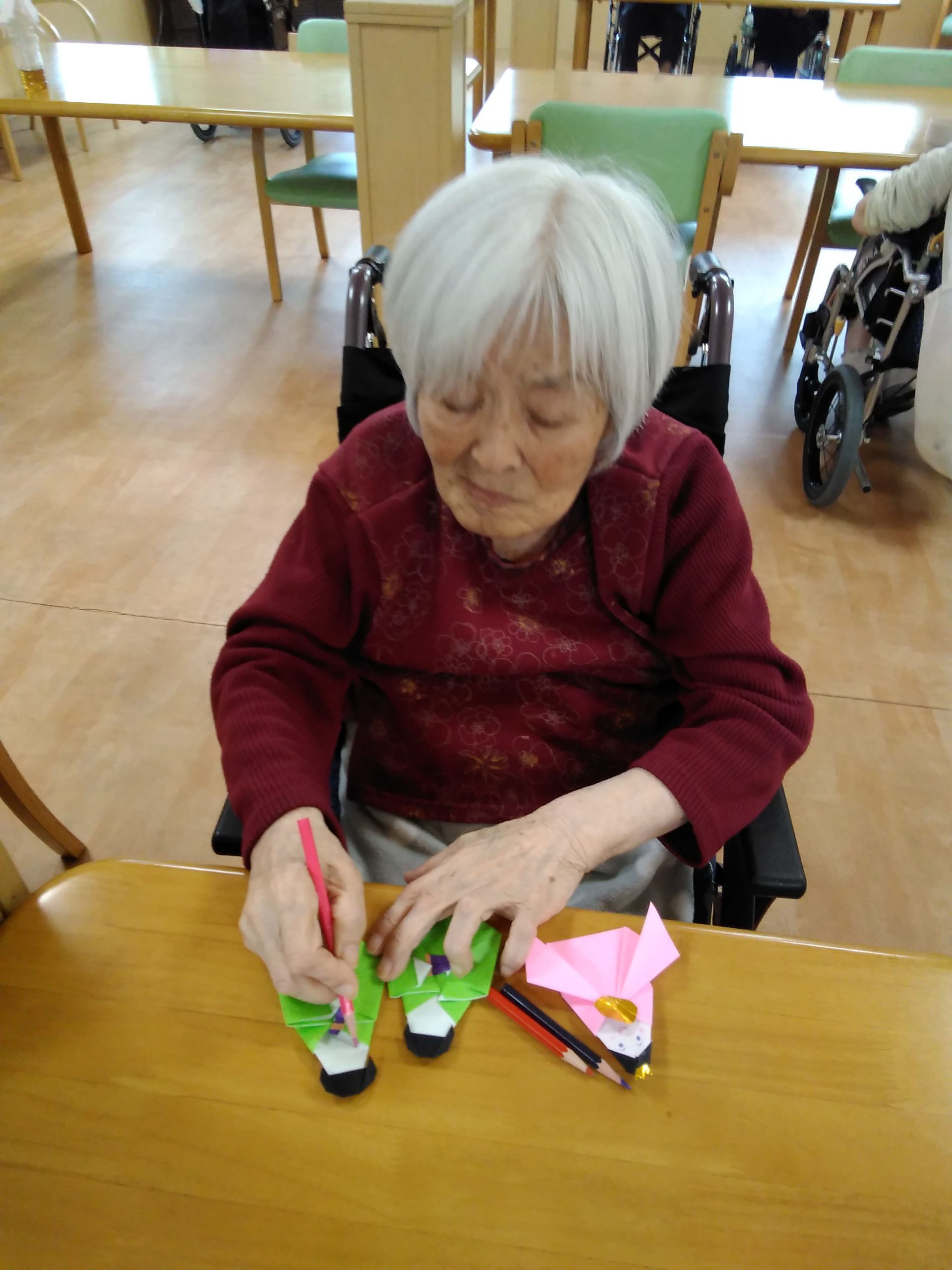 こんにちは! シニアライフ門真 本日は🎎お雛様の顔を書いて頂きました。 目鼻口を書くのは簡単そうやけど難しい! なかなか書けないわぁ~と話されながら 書いて頂きました。 可愛い。凛々しい。お雛様が完成しました。 Back Next