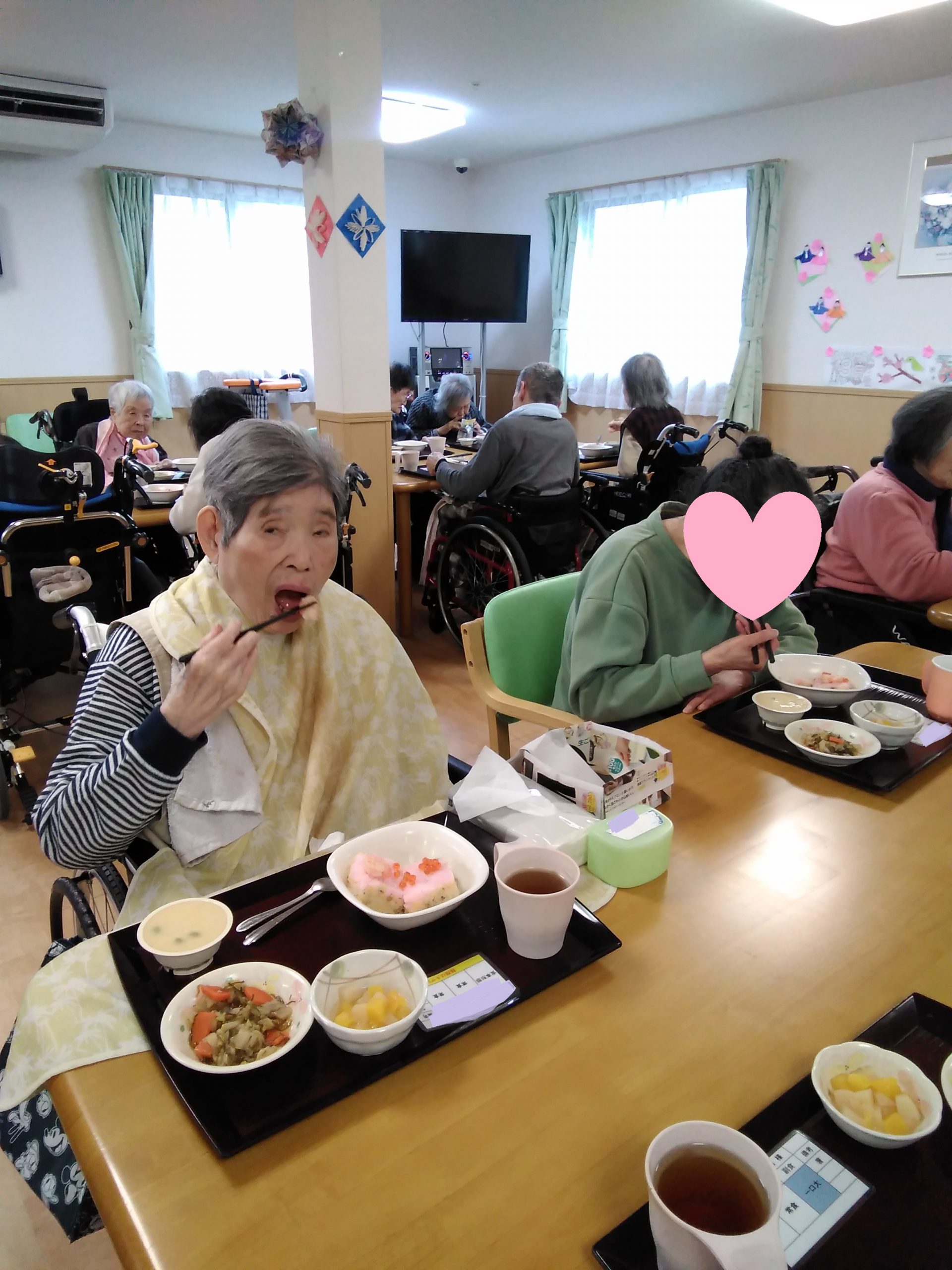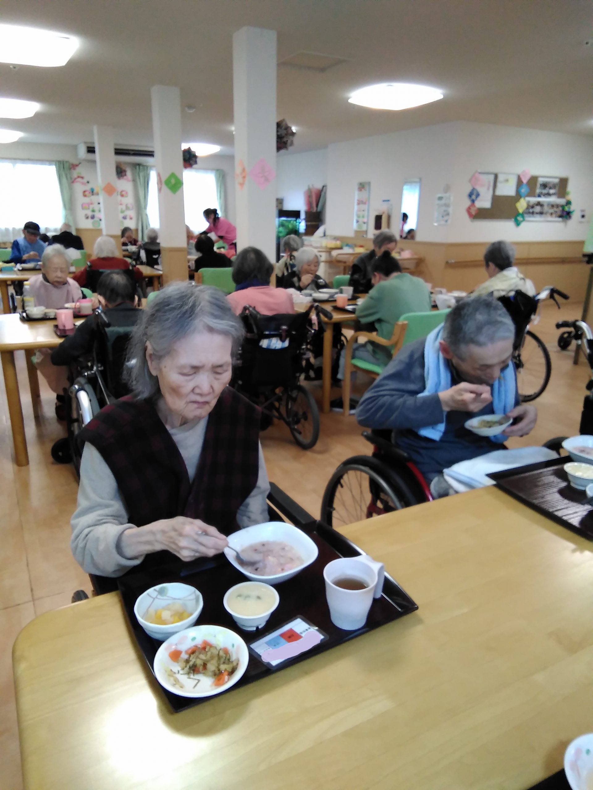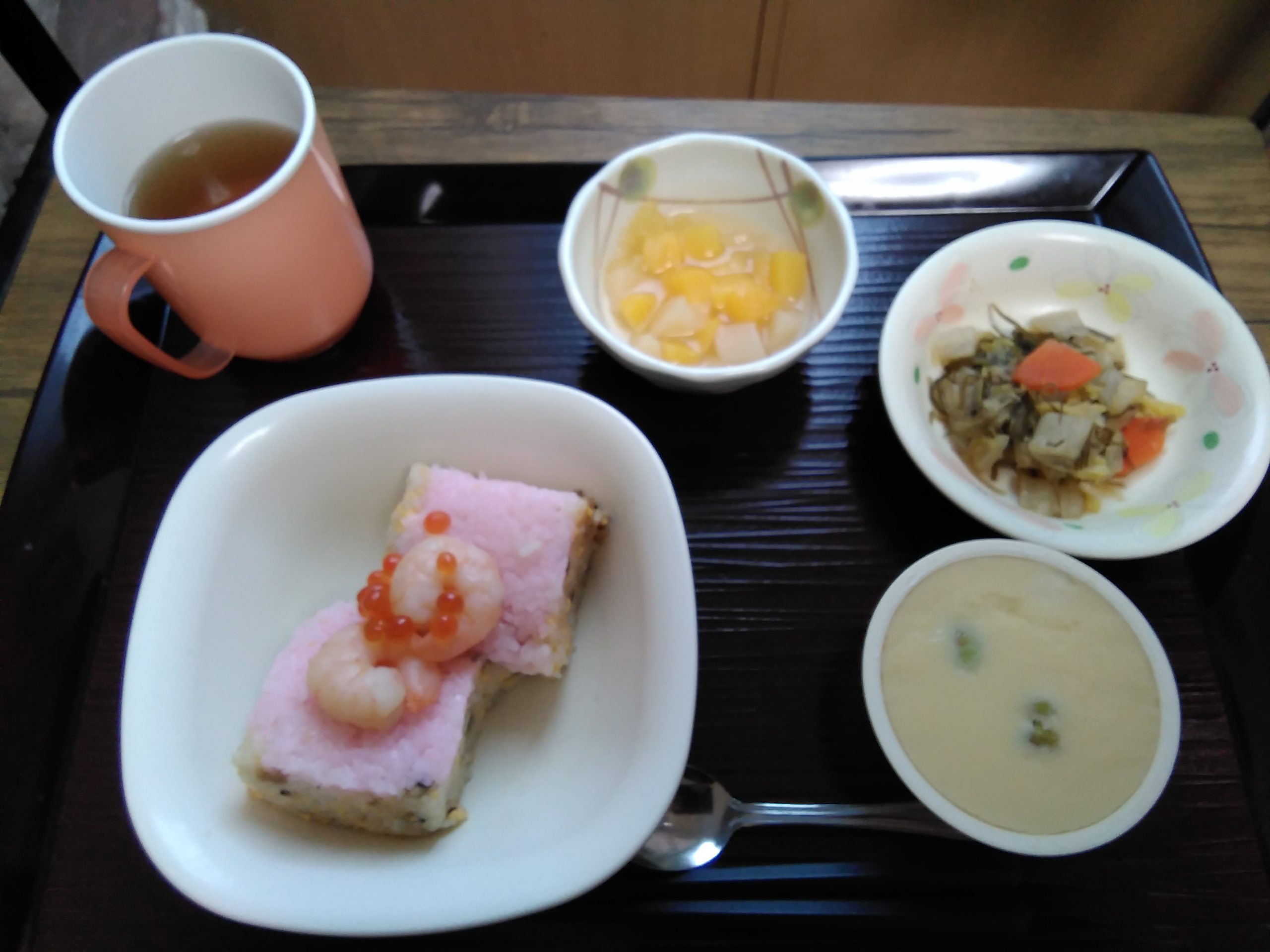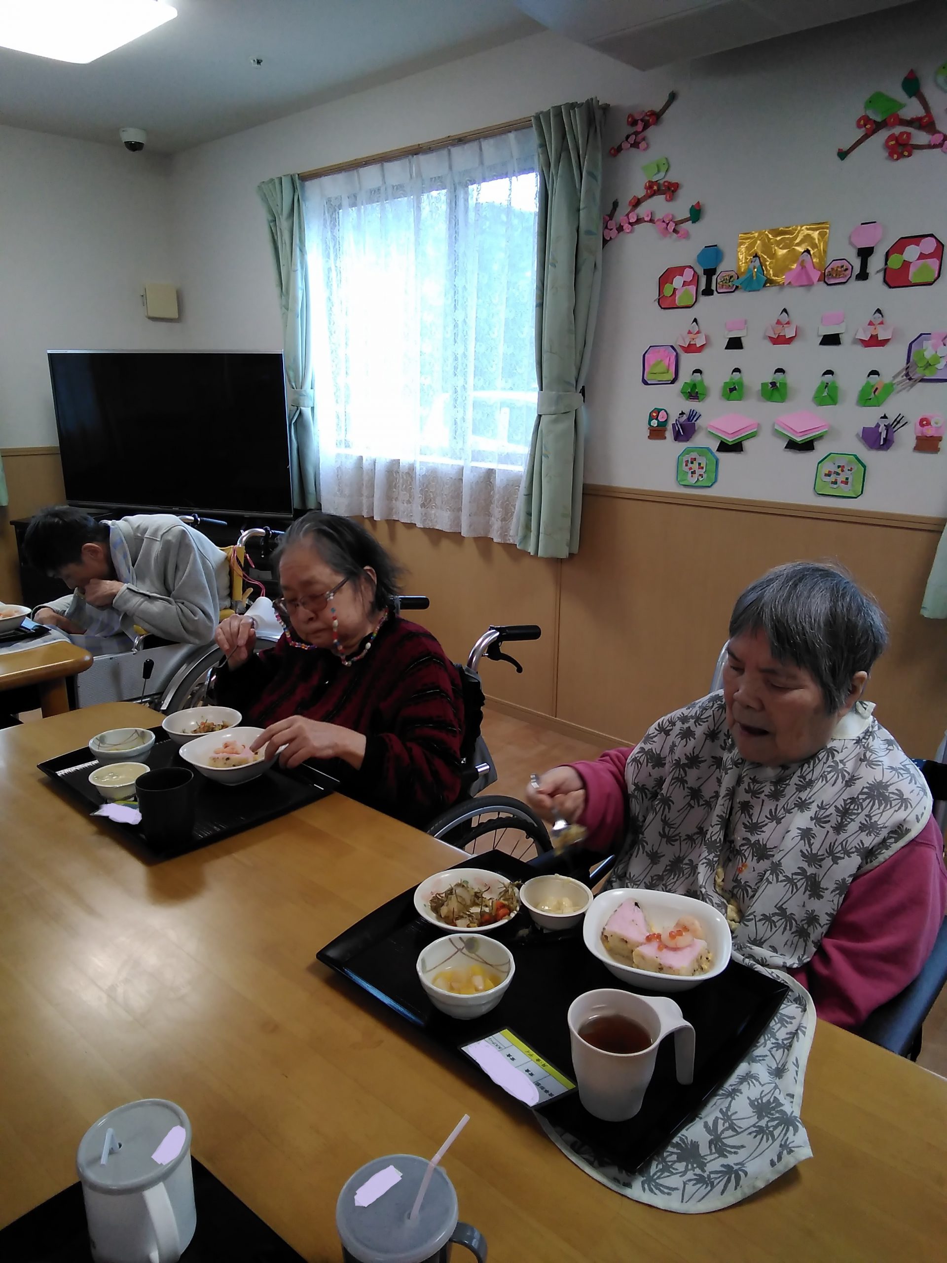 こんにちは! シニアライフ門真 今日のお昼は、ひな祭りメニューでした(^^)/ 菱形寿司・白菜と糸昆布の煮物・茶碗蒸し フルーツ(黄桃缶、白桃缶)です! 今日がお雛さんかー!嬉しい!美味しい!と 好評でした(#^.^#) Back