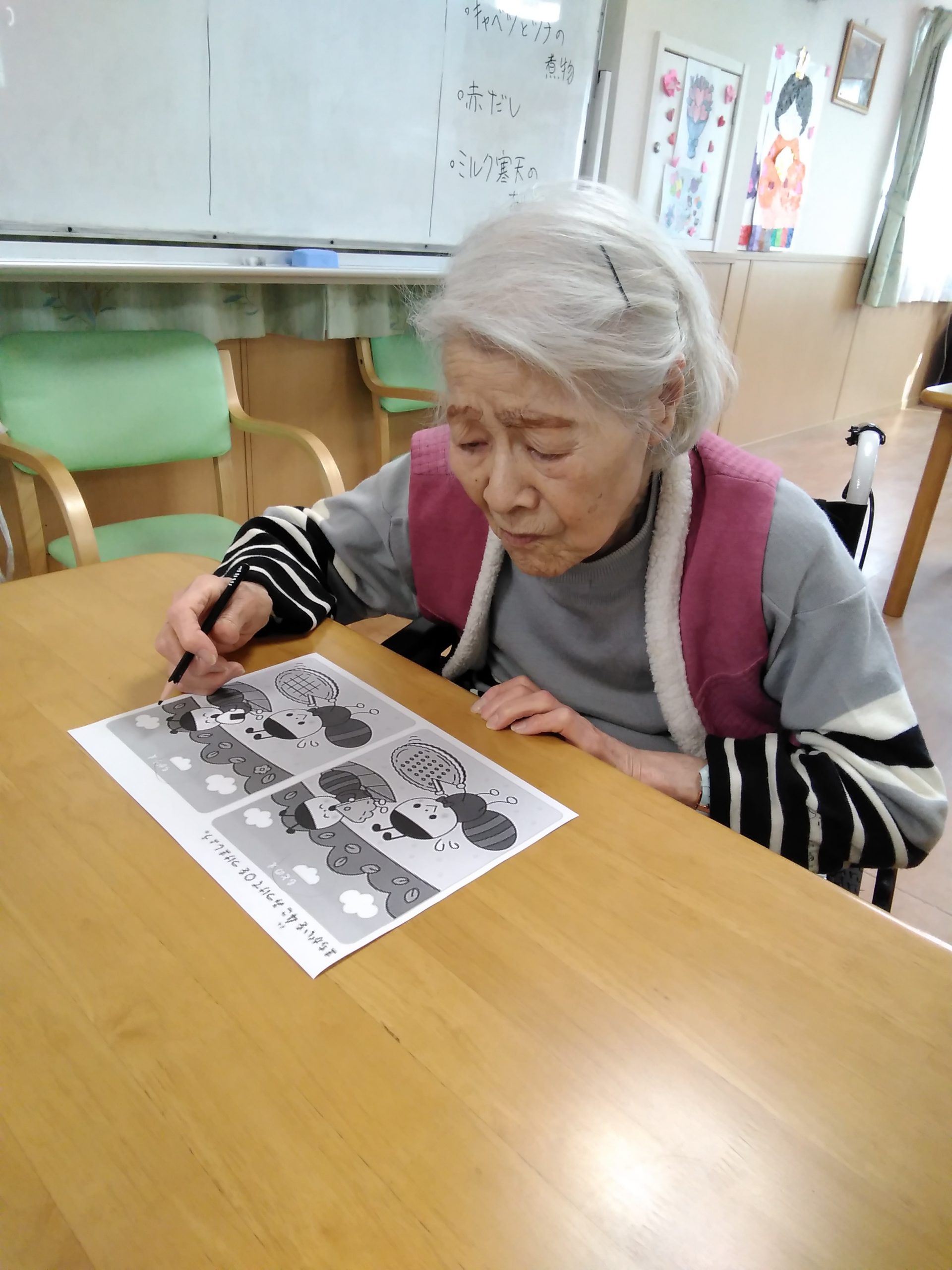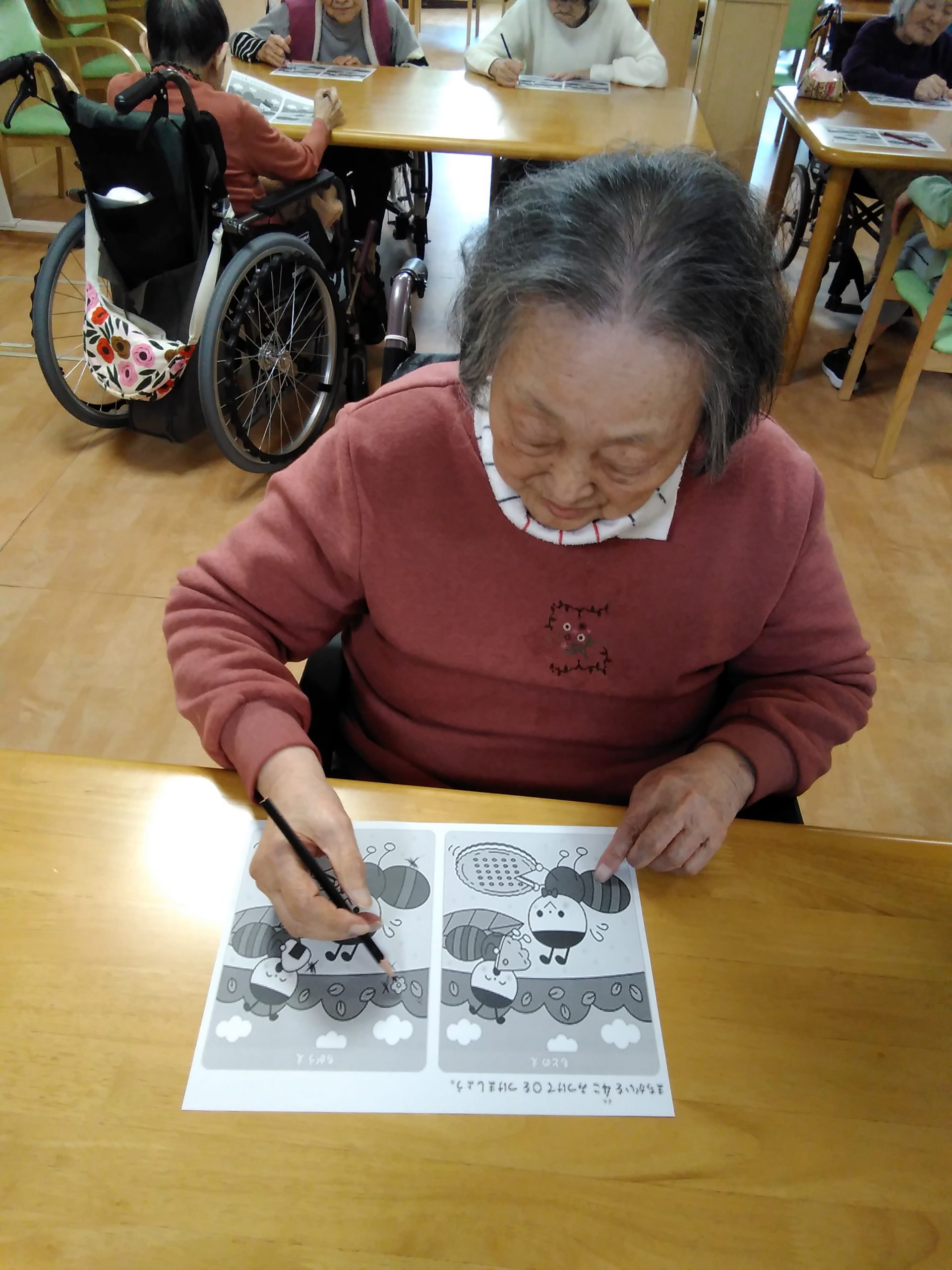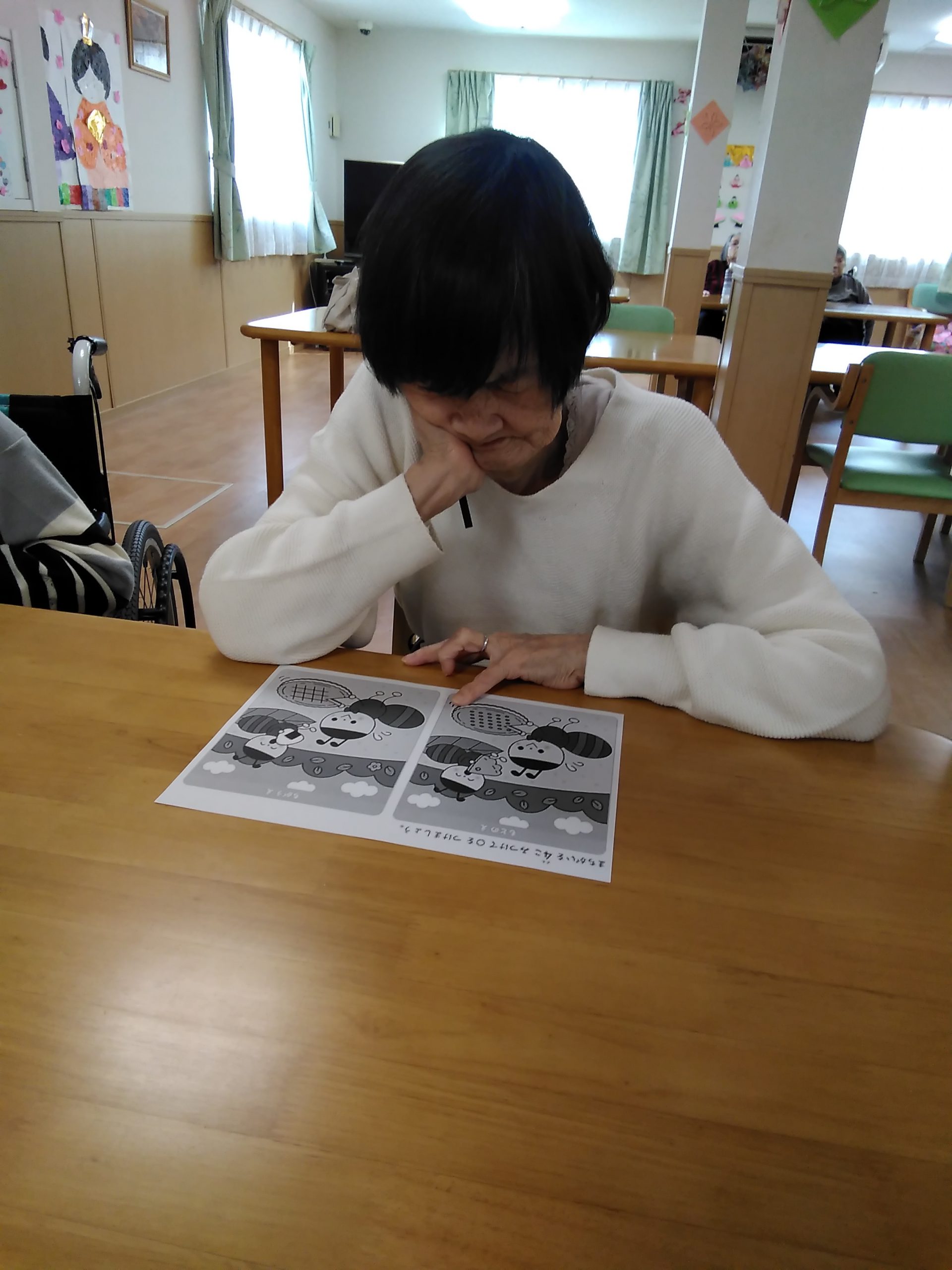 こんにちは! シニアライフ門真 本日は、4つの間違い探しに 挑戦して頂きました。 わから~ん!どこやぁ!などと話されて おられましたが、見つかると あっ!あった。簡単やぁ。 など楽しそうに探しておられました。 Back Next