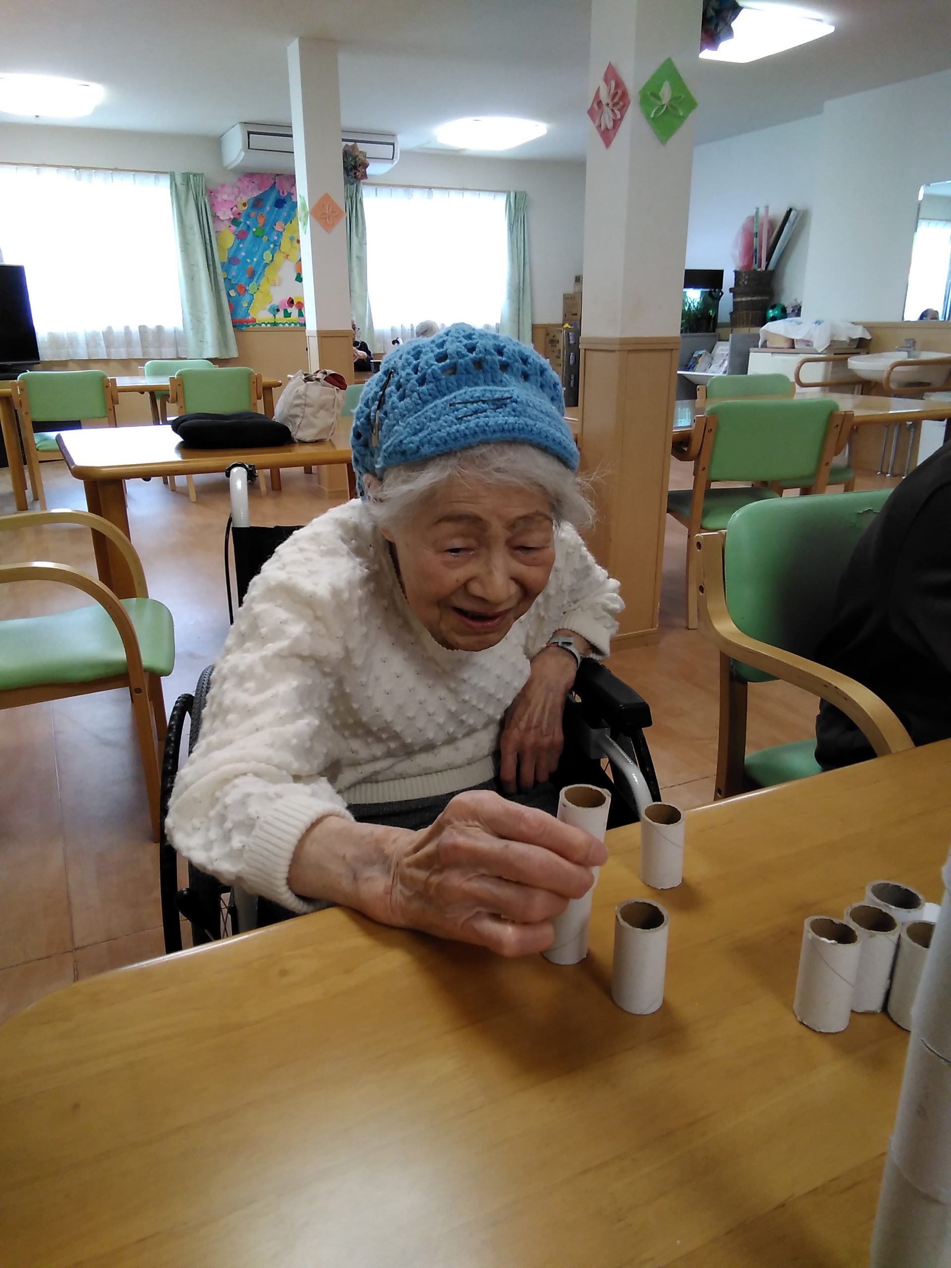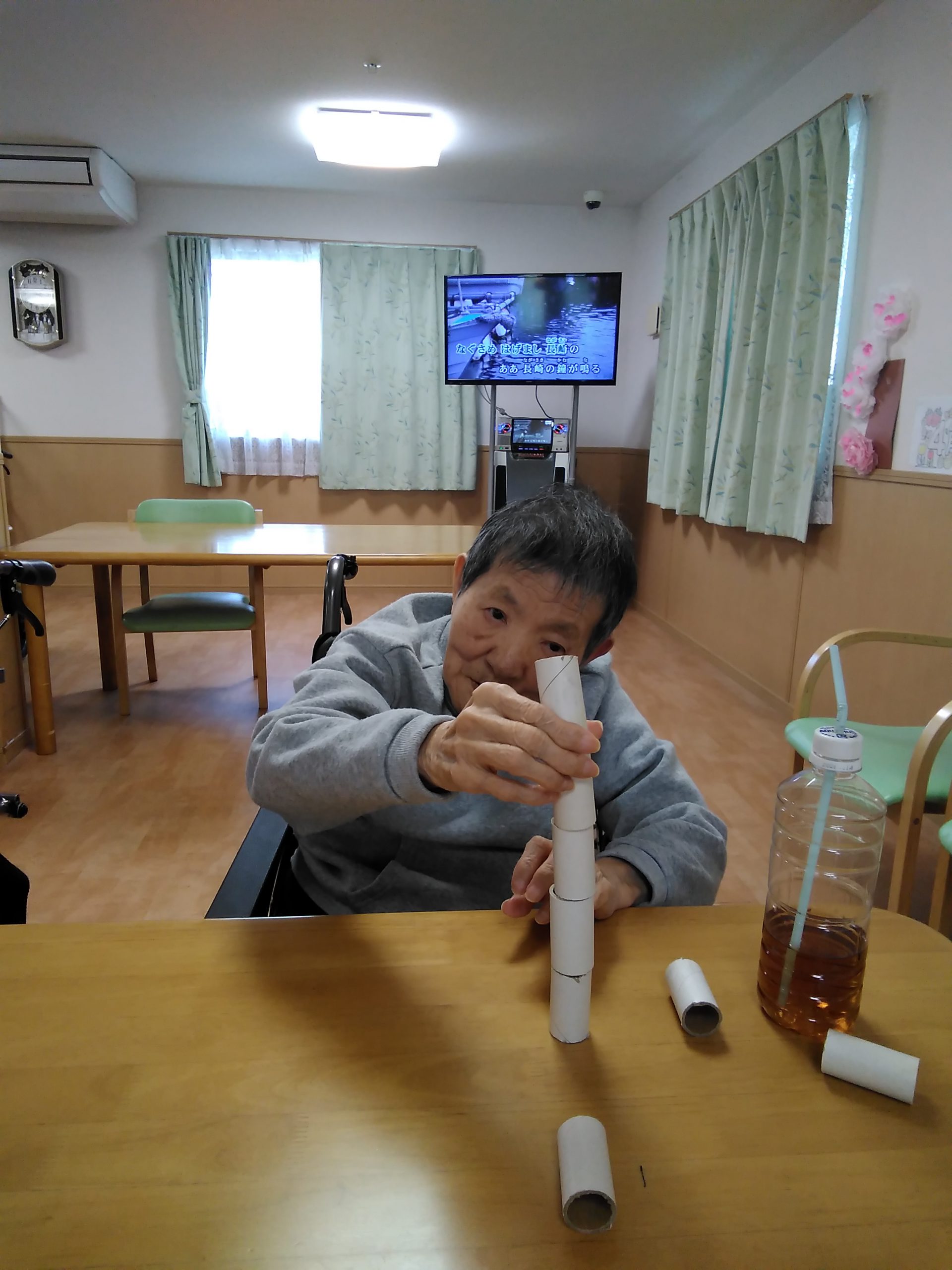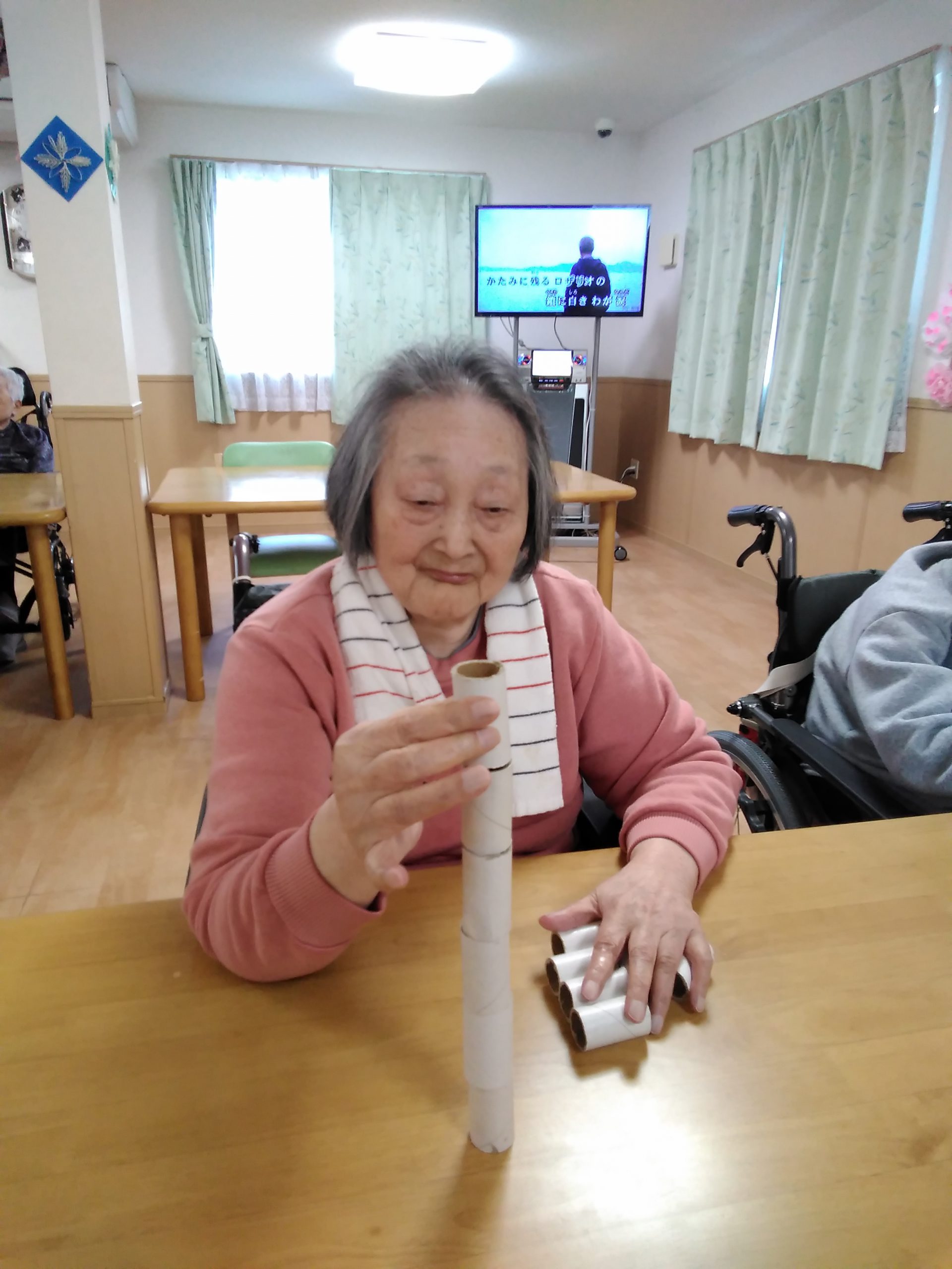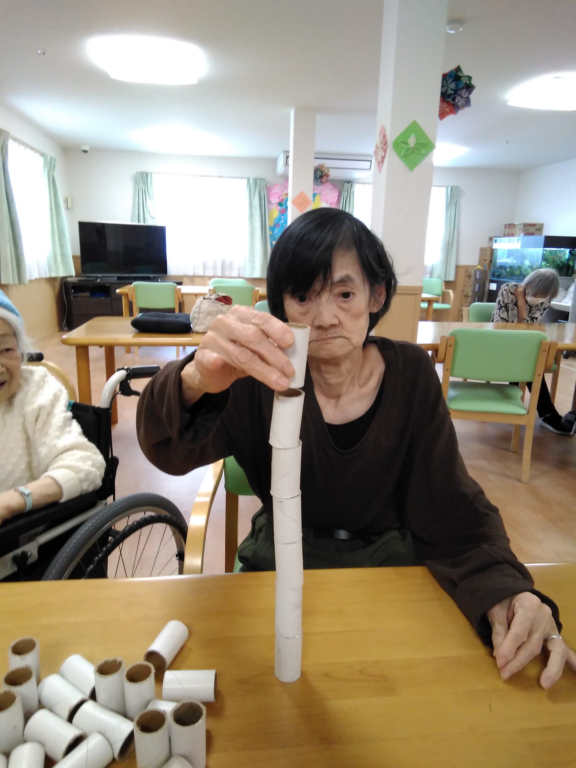 今日は、ラップの芯で積み木タワーに