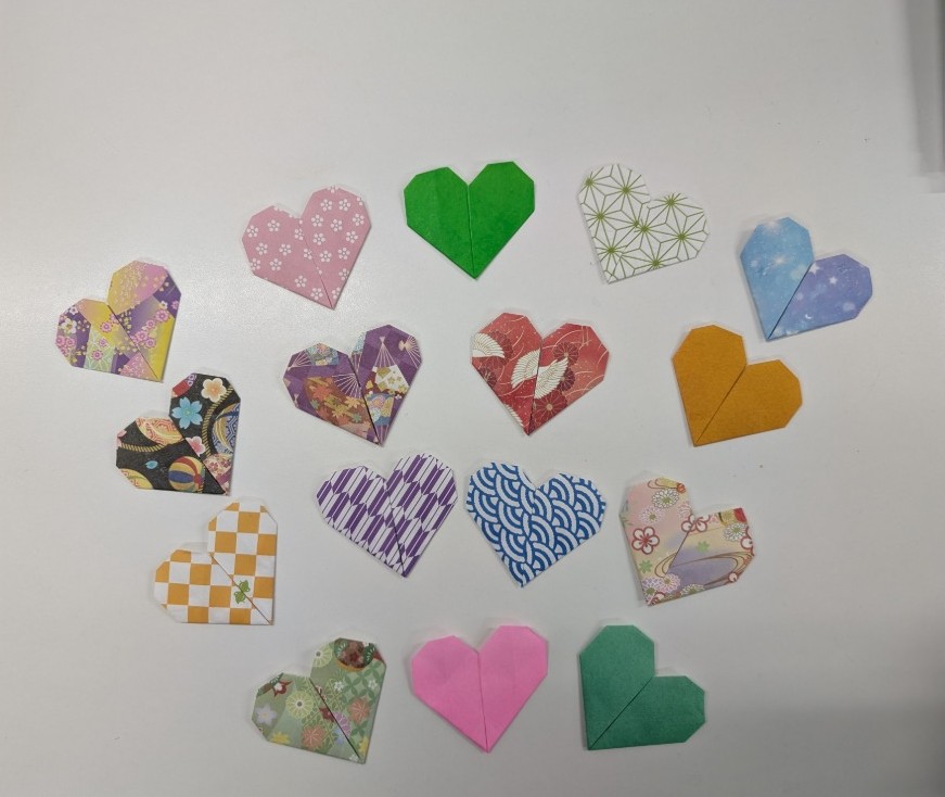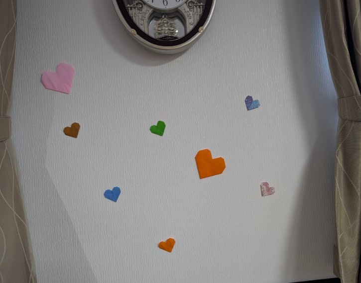 今日折って頂いたハートは、食堂の壁に飾らせて頂きました。