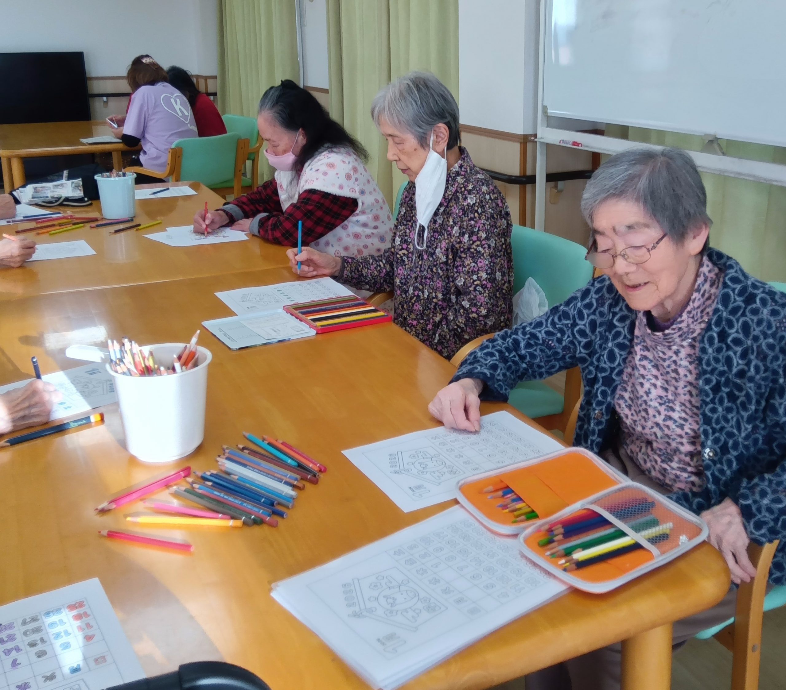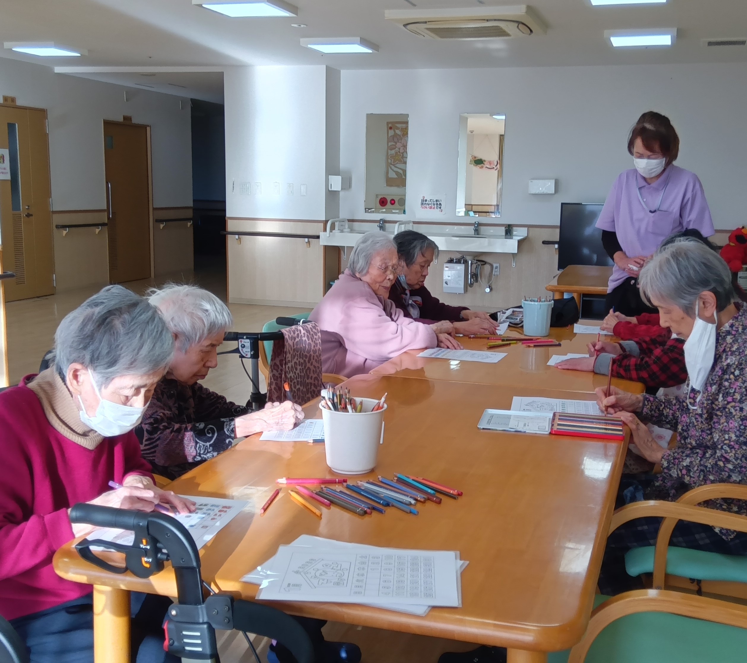 今日は、レクリーションで塗り絵カレンダーに取り組んでいただきました。