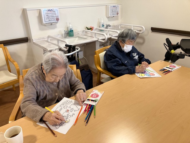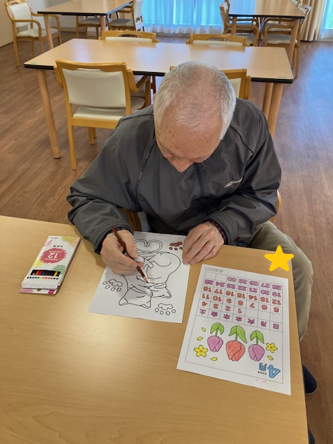 こんにちは。 シニアハウス桃山です。 今日は、塗り絵を行いました。 4月のカレンダーの続きや、春らしくチューリップの 絵などに色を塗って頂きました。
