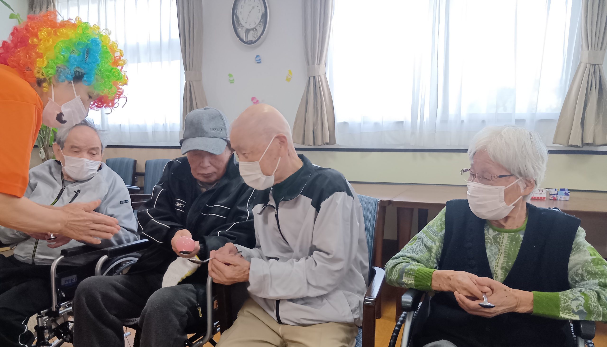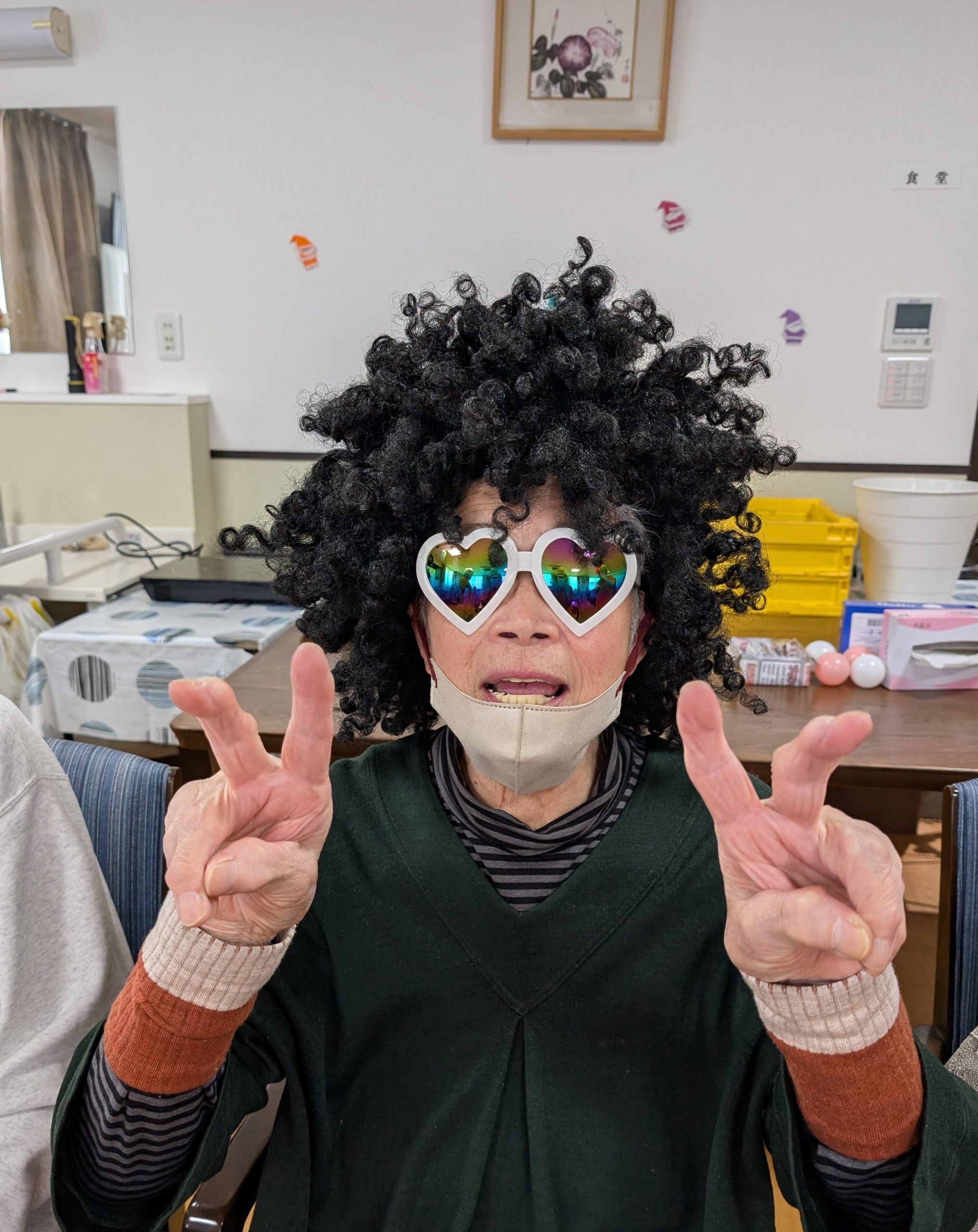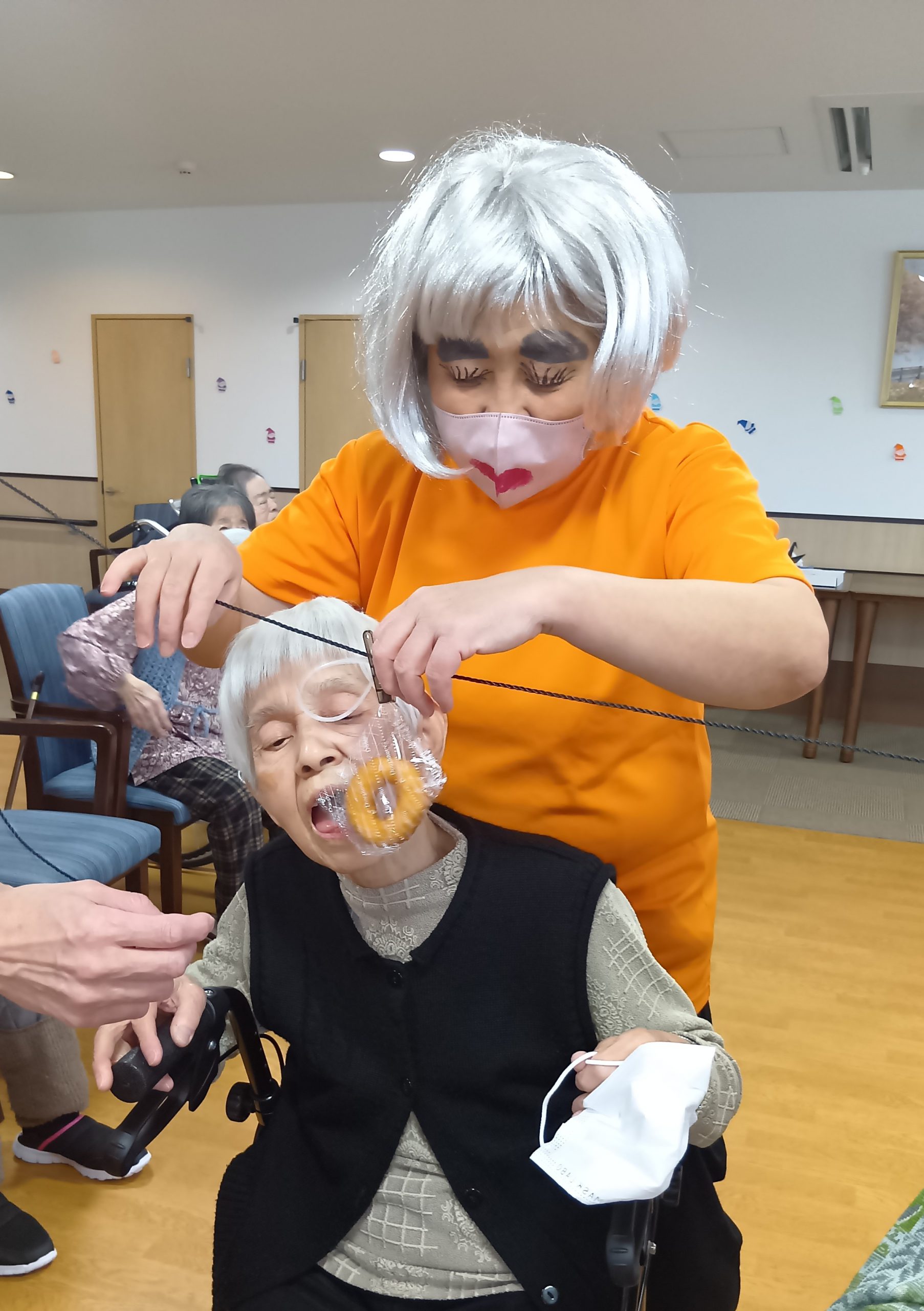 おやつとジュースを飲んで頂いている間に、いつの間にか色んなカツラを被って