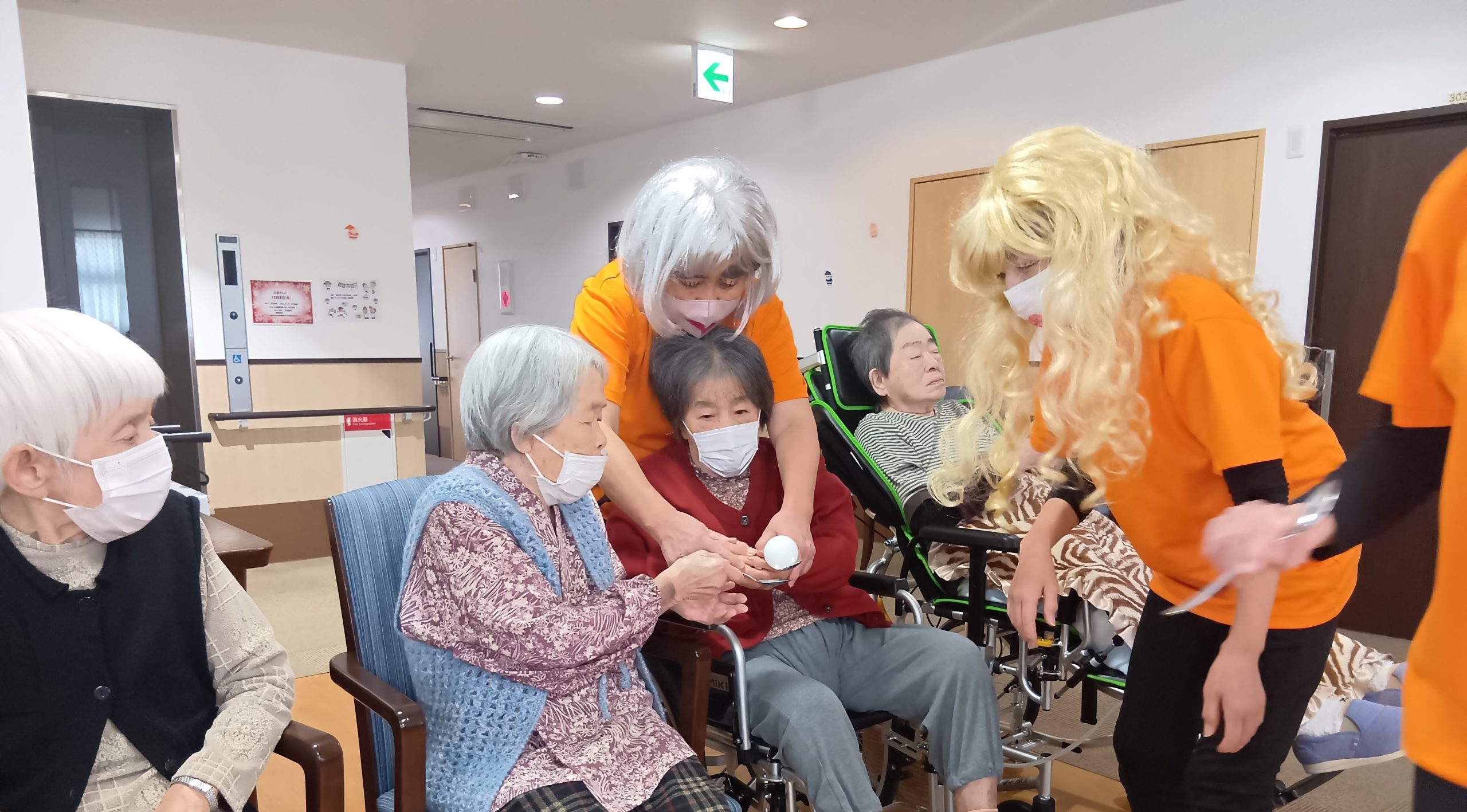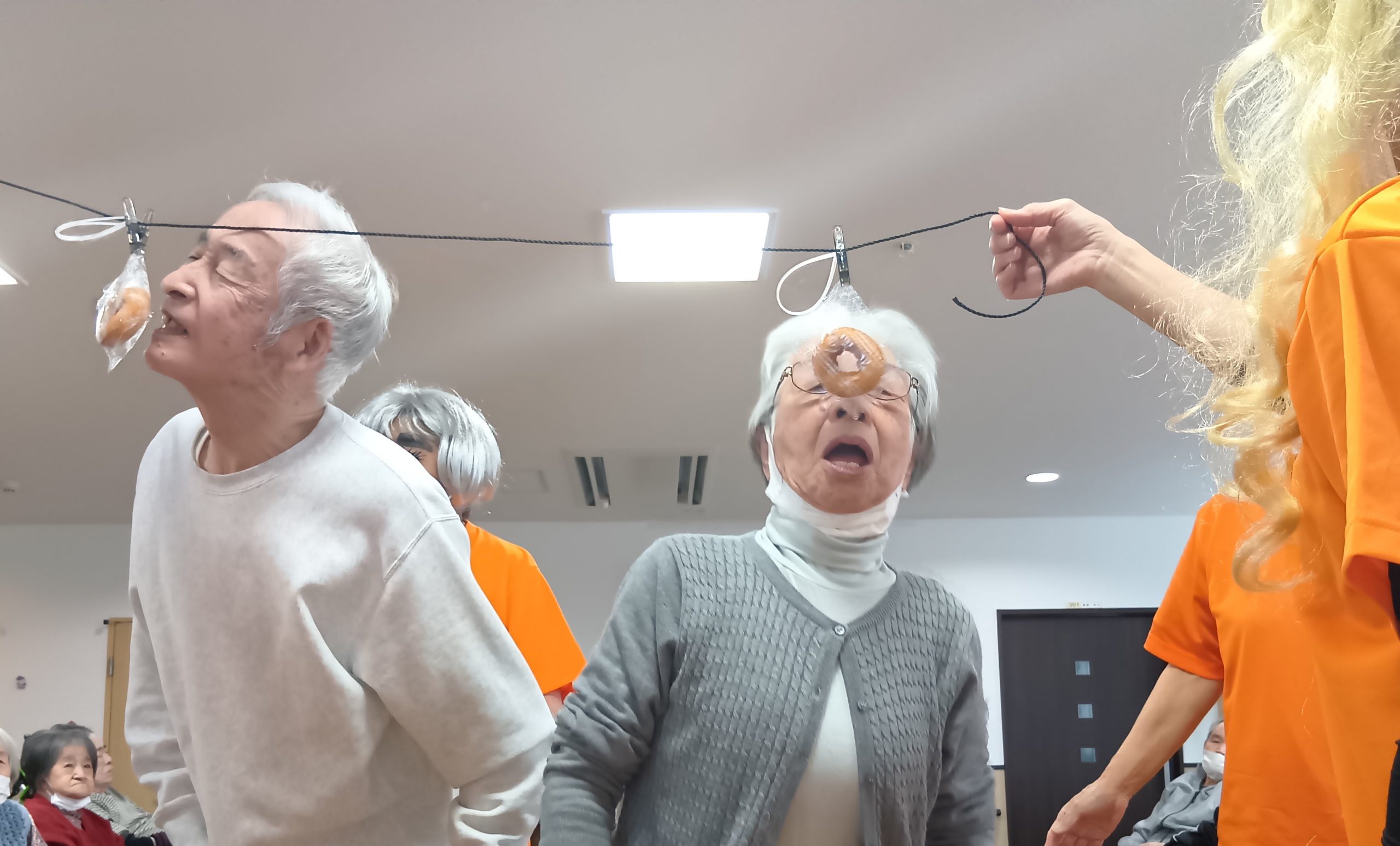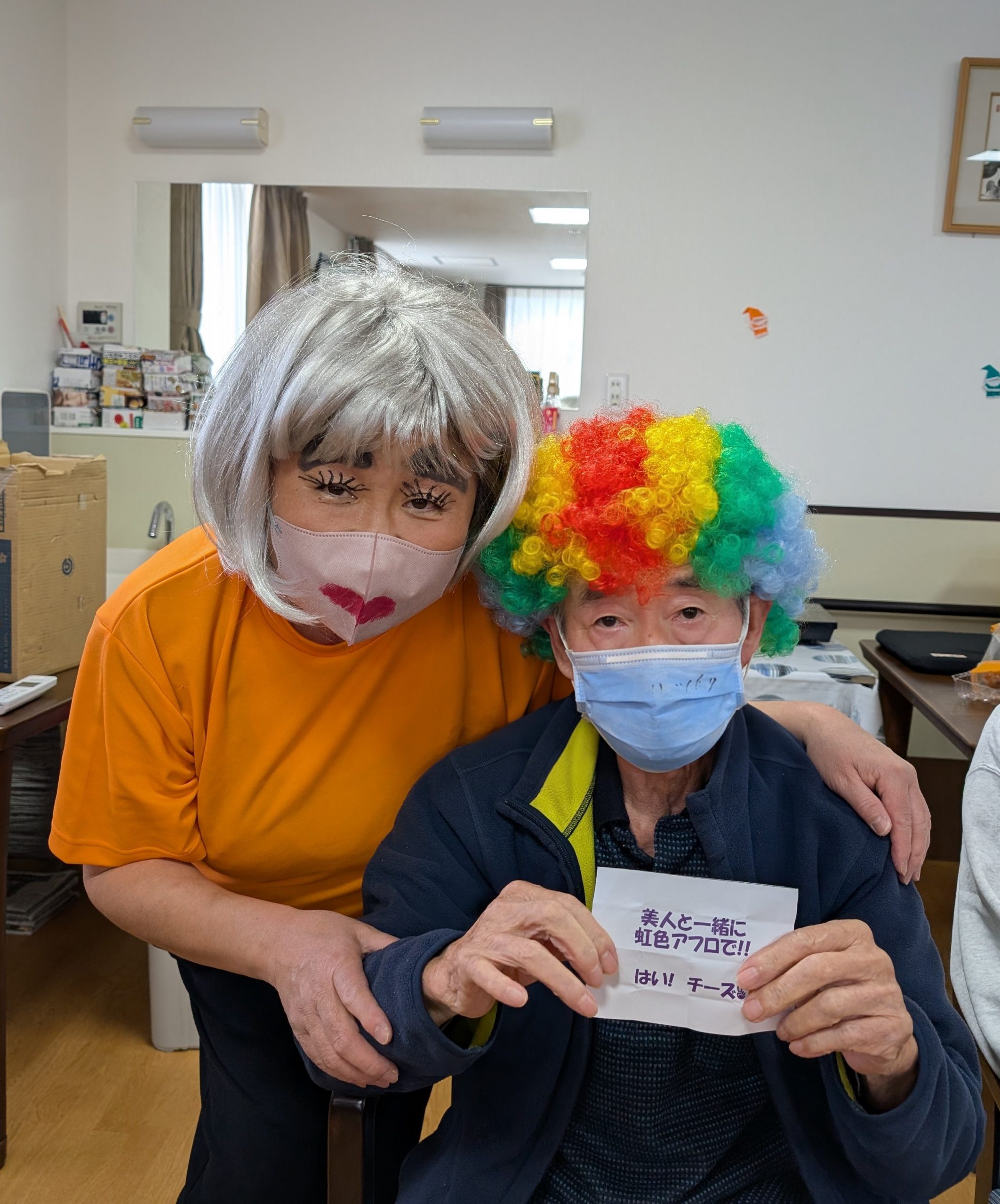おやつとジュースを飲んで頂いている間に、いつの間にか色んなカツラを被って