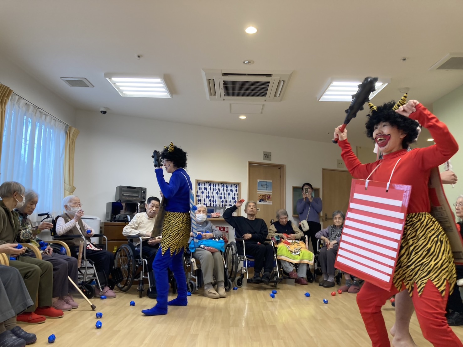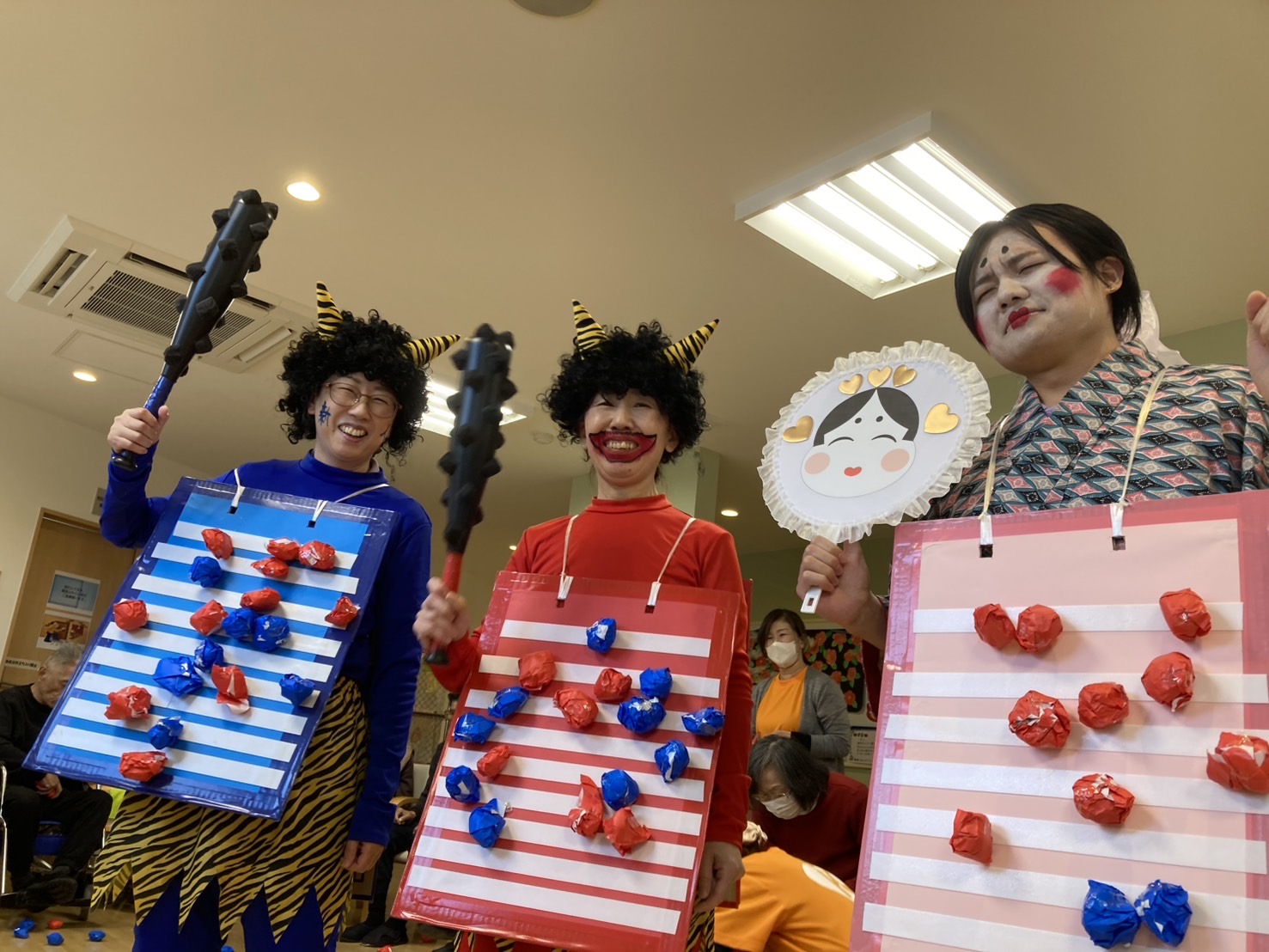 節分 シニアライフ橿原 本日は節分行事を開催いたしました。 「節分劇場」として寸劇を行いました。 鬼と福の神に扮したスタッフをみて皆様大笑い。 また豆まきゲームでは各チーム張り切って 鬼を倒しておられました。 Back Next