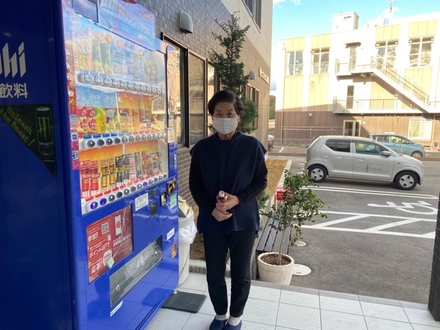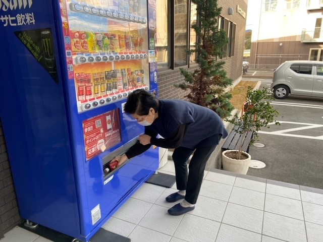 自販機で飲み物を購入されている入居者様のご様子を撮影させていただきました。