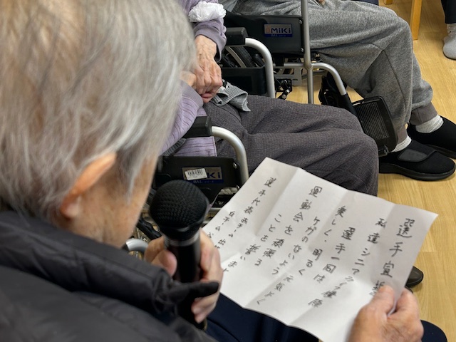 つづきまして赤組代表の入居者様、白組代表の入居者様様による選手宣誓。