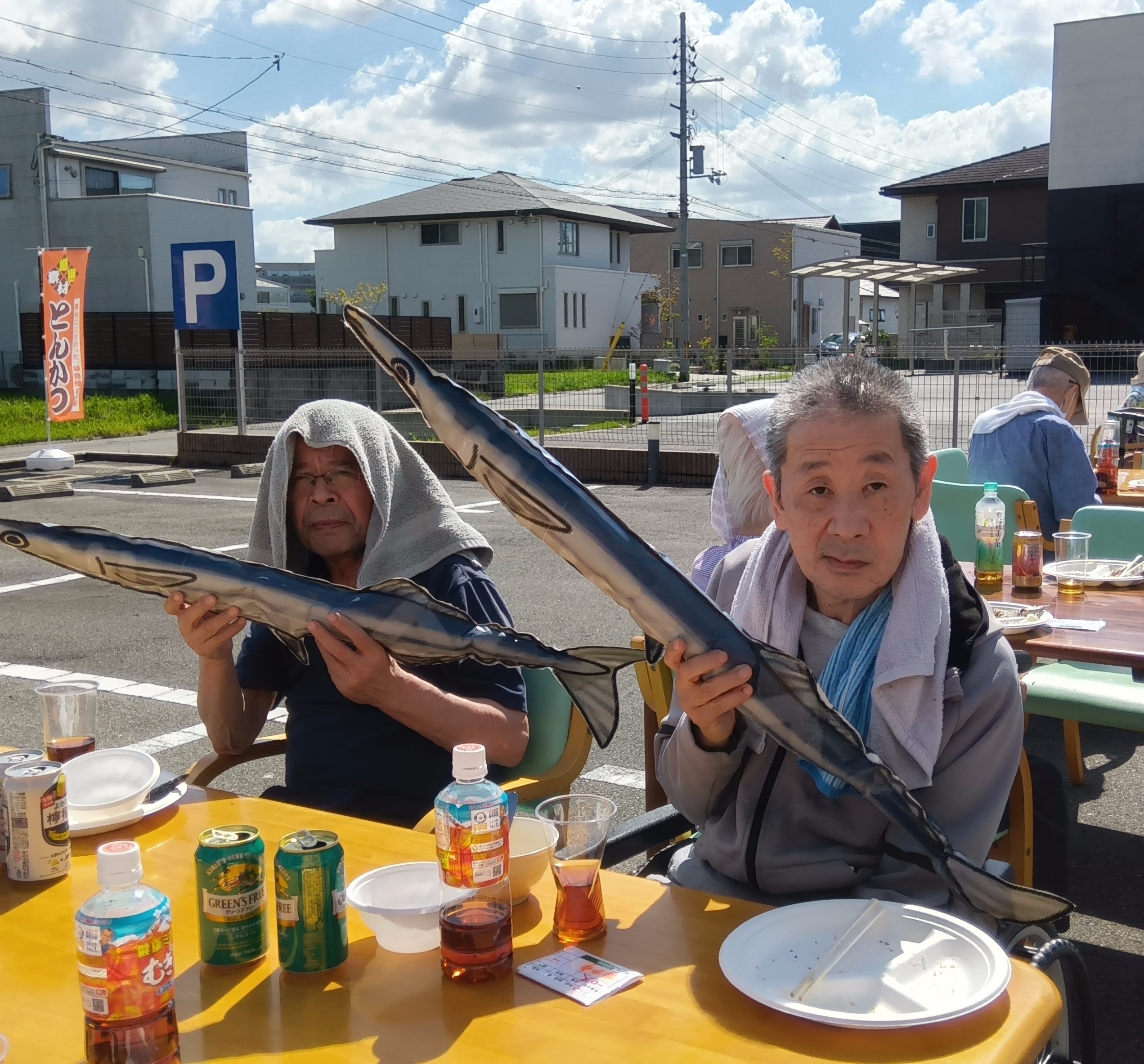 青空のもと炭火焼の秋刀魚とさつまいもご飯など秋らしいメニューを召し上がっていただきました。