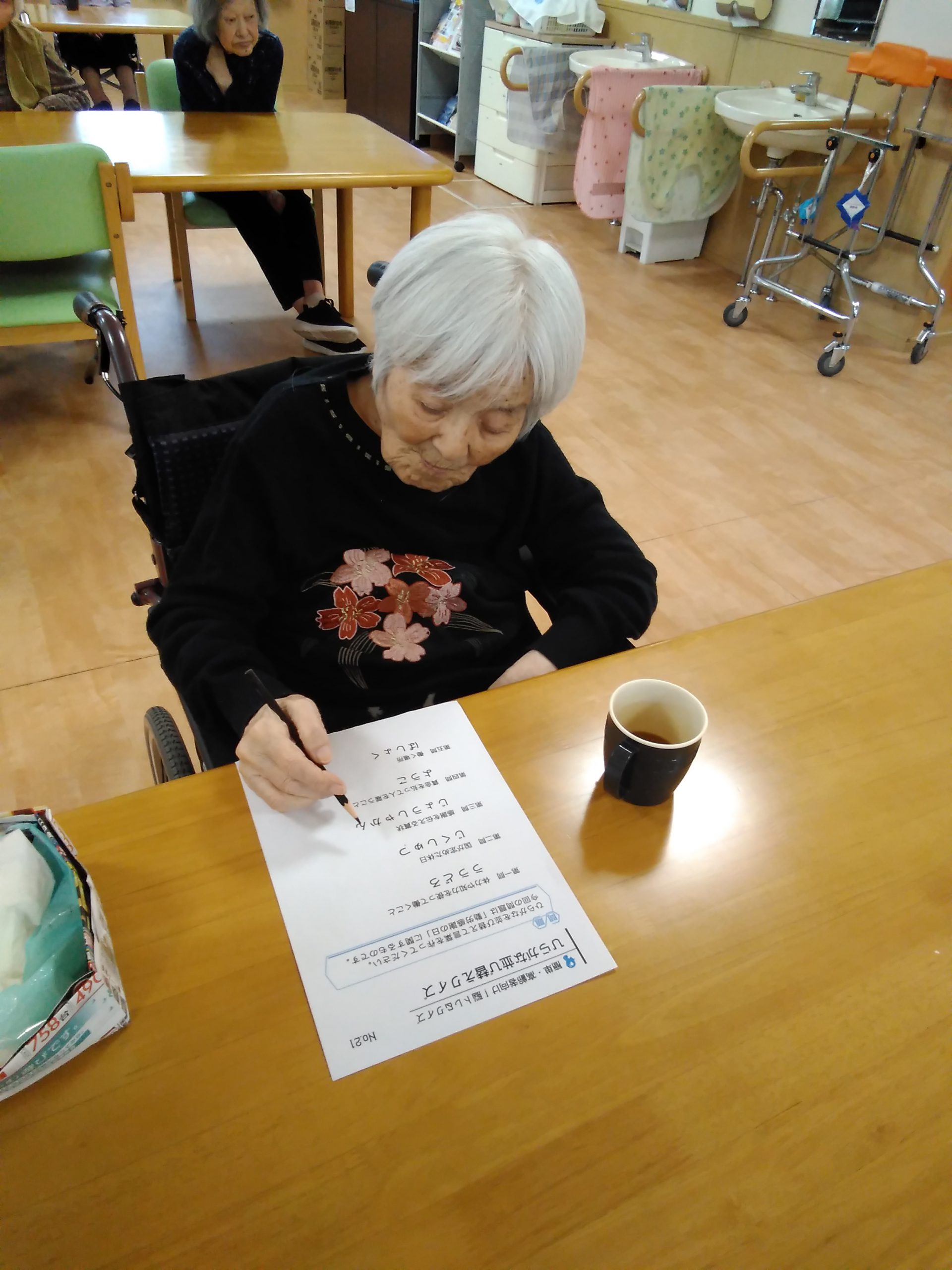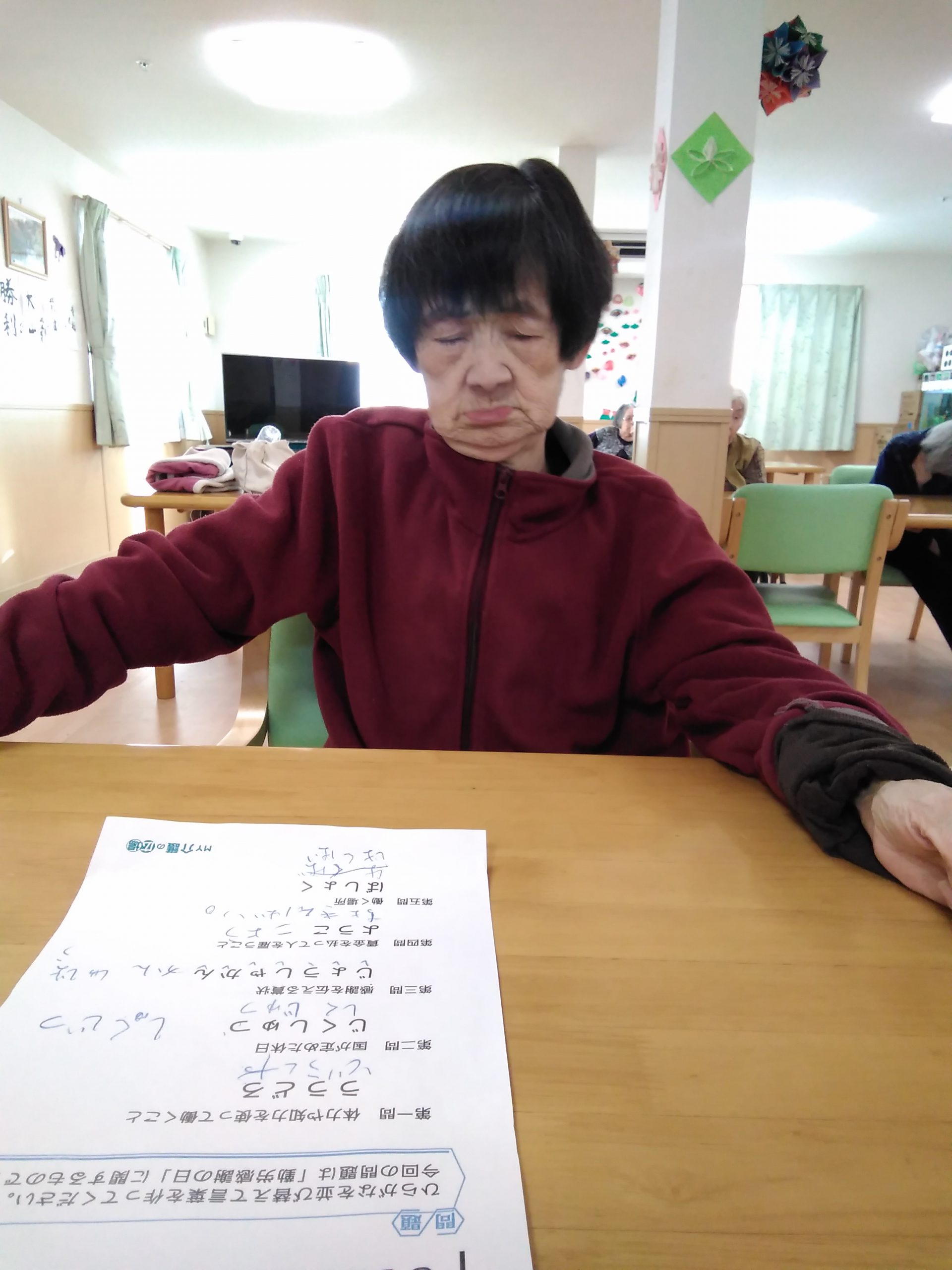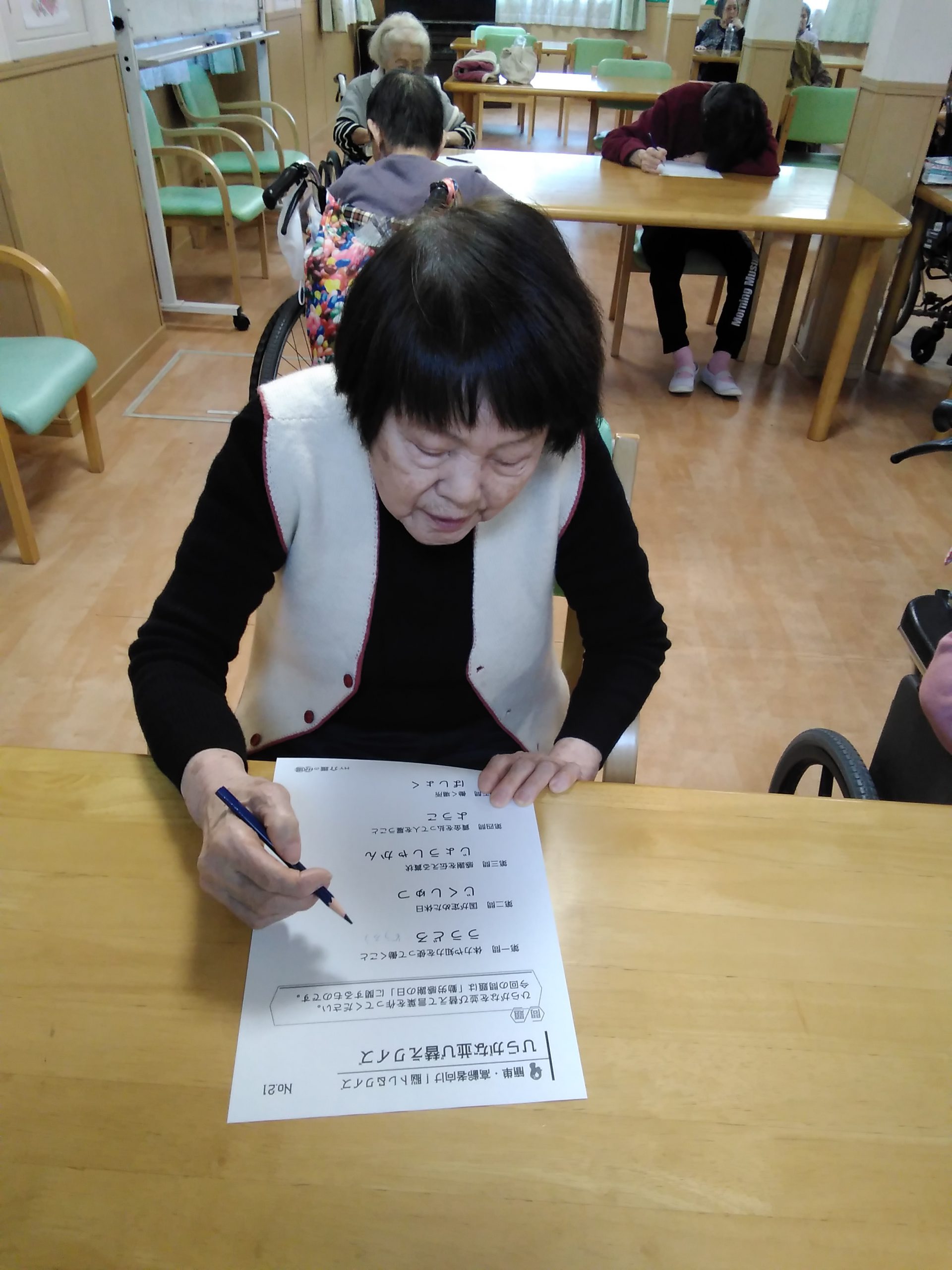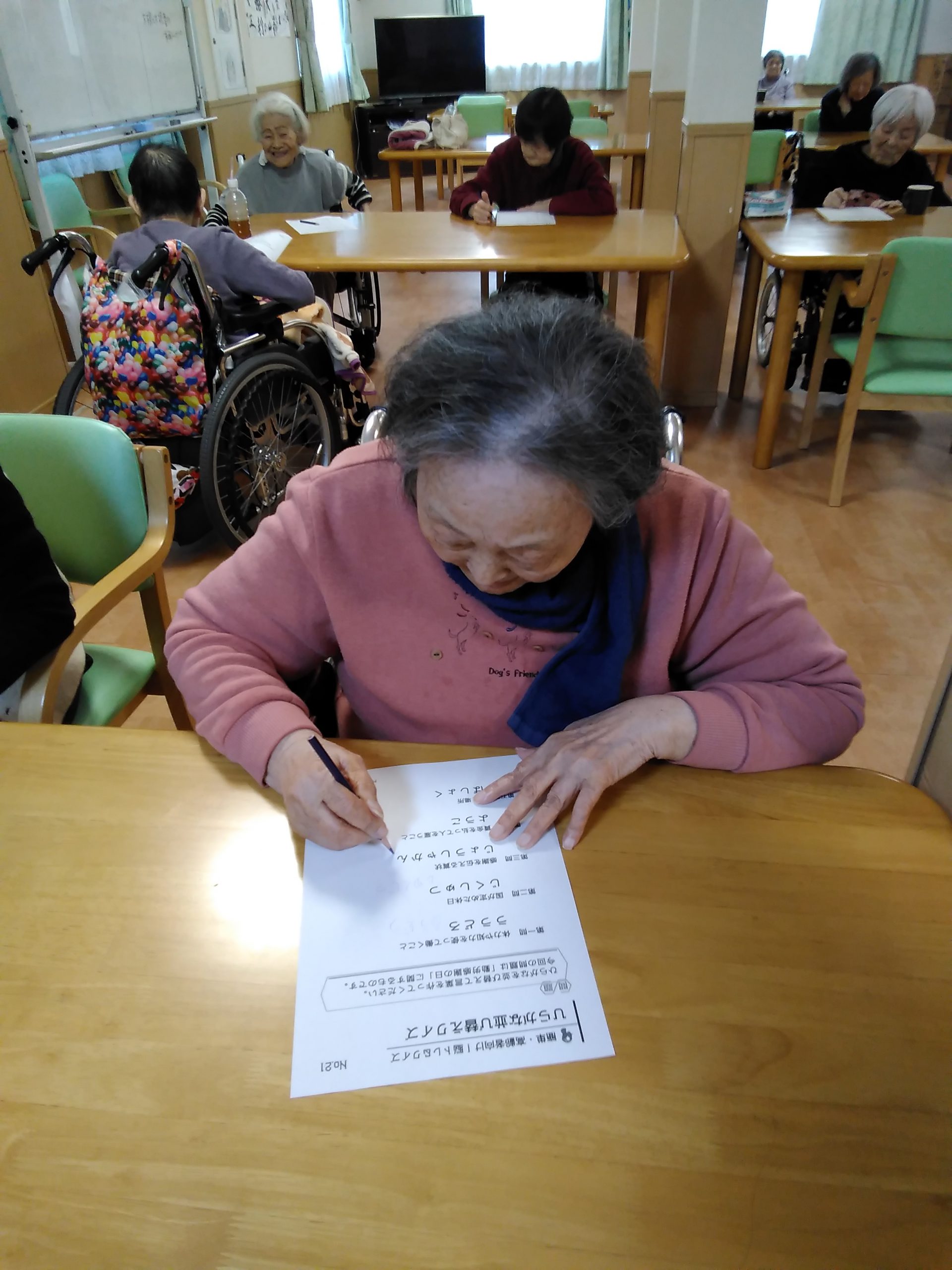 シニアライフ門真 本日は、ひらがなの並べ替えクイズを して頂きました。 意味が分からん。なんて答えたらいいの? など皆さん色々話されておられましたが 一生懸命に答えて下さいました。 漢字で答えられる方もおられました。 Back Next